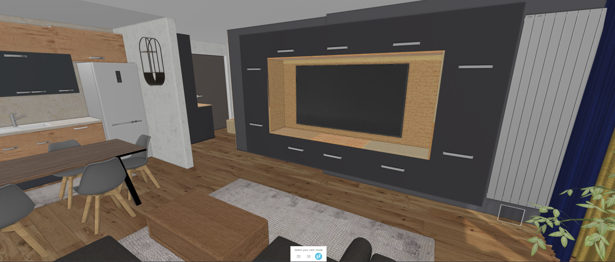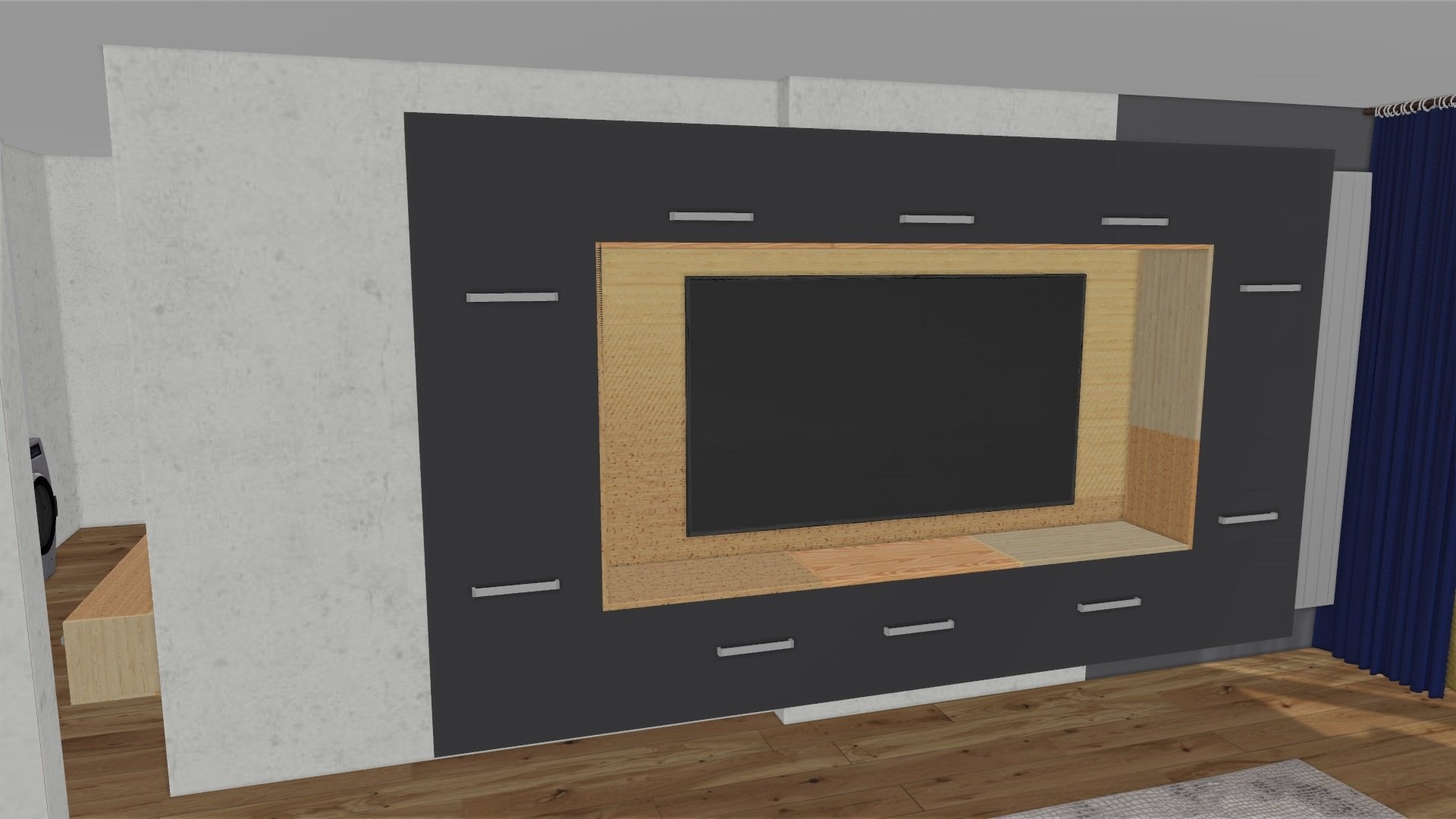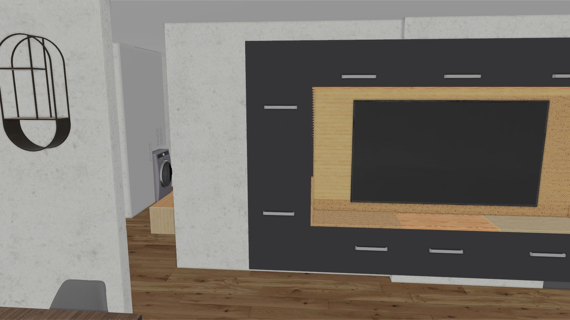 Аз също не бих напъхала ТВ в тази правоъгълна кутия, един красив сайдборд с чекмеджета ще е по - добре. Като цяло тази мода, както и на дървесно-бетоновите комбинации, след някоя година може да е непоносима. С малко повече фантазия, някоя кръгла форма, елементи от бронзово стъкло, повече текстил, изчистеност и по-малко джунджурии ще стане далеч по- уютно.