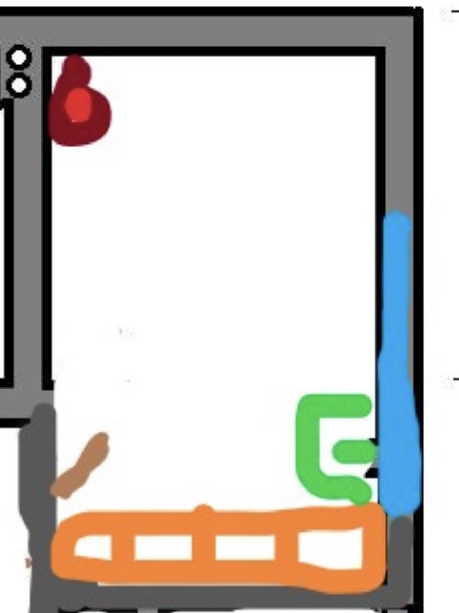 Да поясня - вратата към стаята ще бъде плъзгаща, оранжевите квадрати са кухнята и хладилник, а синьото- мивка пред прозореца.