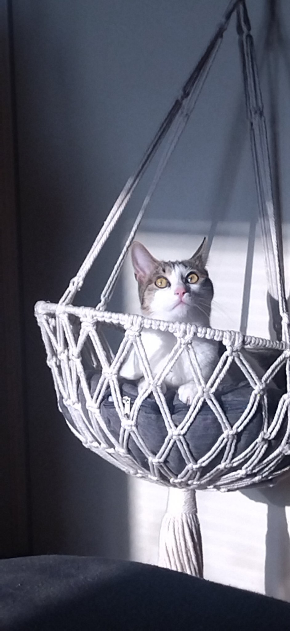 Аз на нашата й взех не люлка, а хамак, но го ползва с подобна функция, много обича да скача и да се залюлява. Още не смеем да го качим на много високо, защото се хвърля така смело, я няколко пъти се прекатурва.