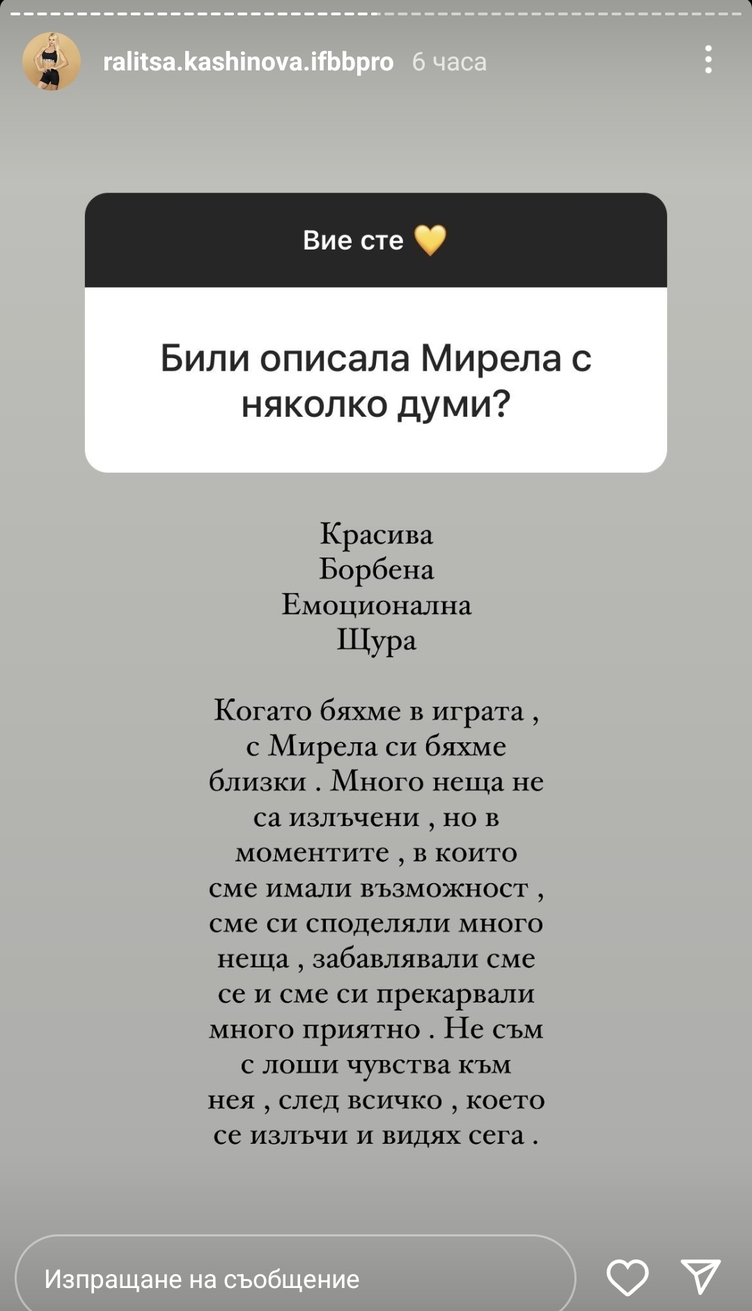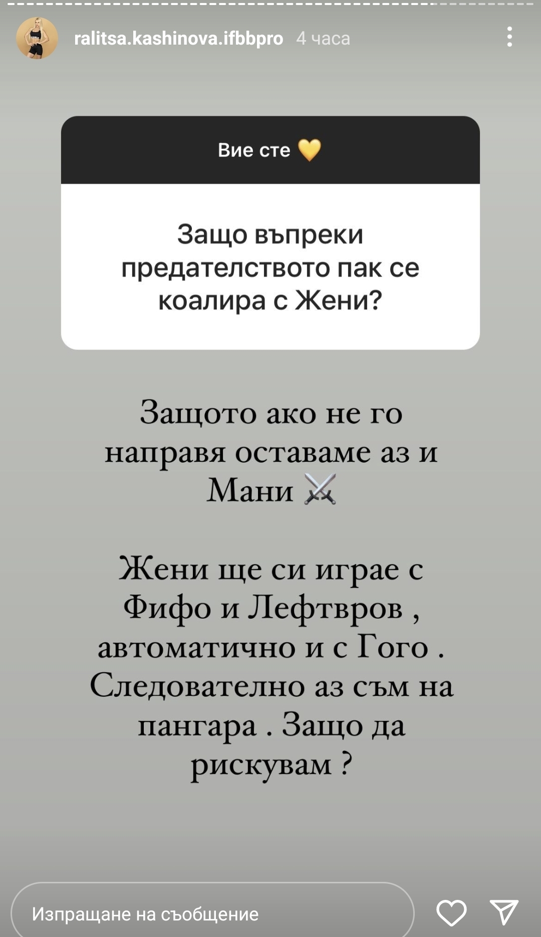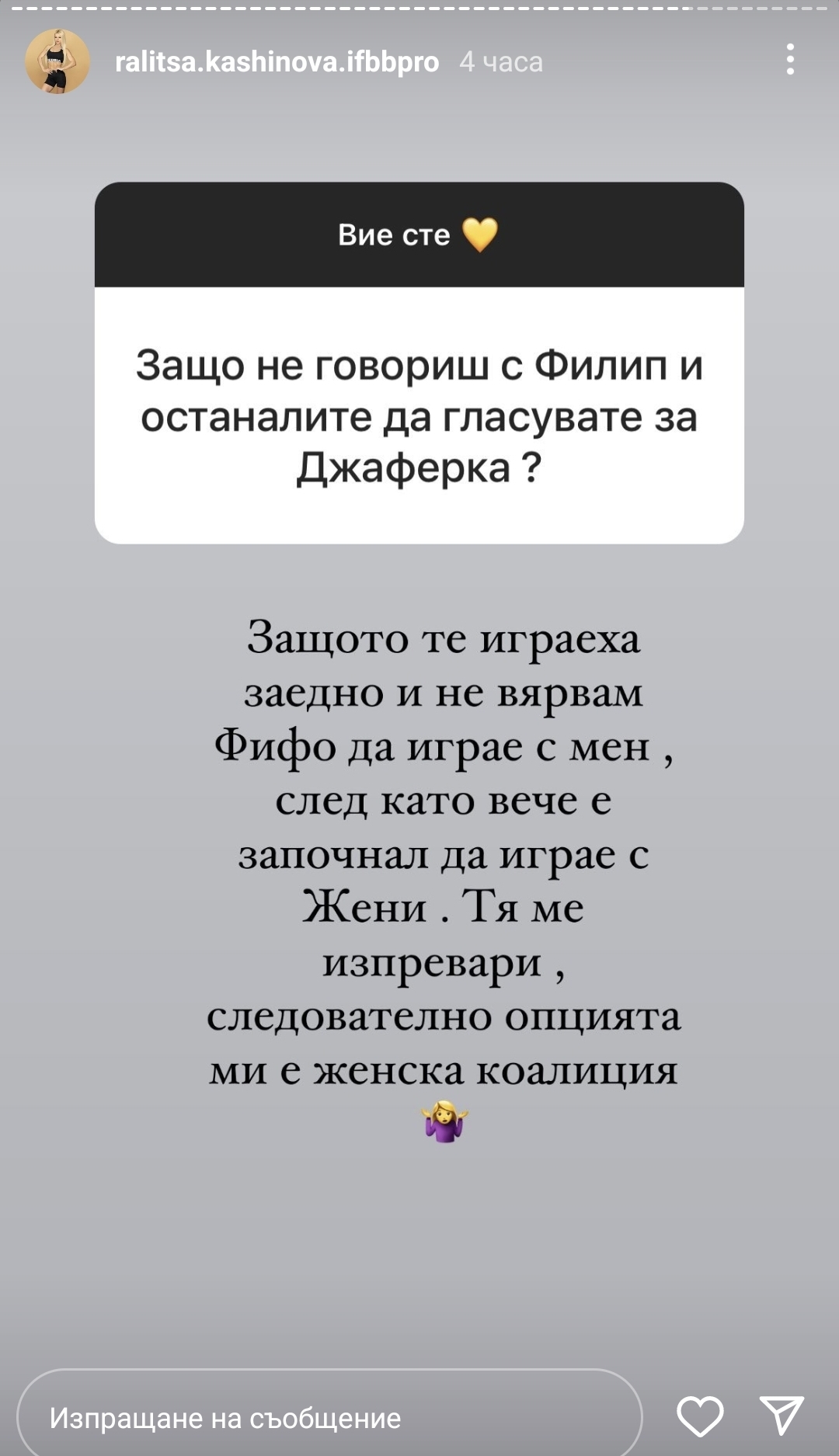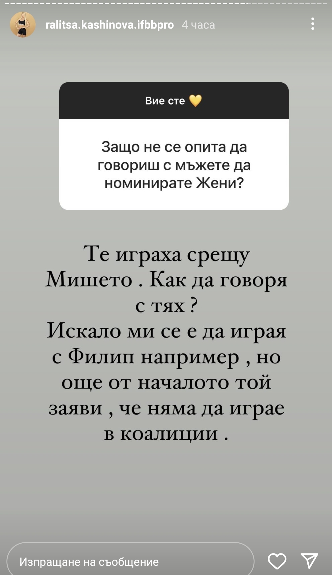 Ралица отговаря на едни и същи въпроси, защото според мен част от зрителите не могат да съберат 2+2, защо все още играе с Жени - защото няма избор, защо не е говорила с Филип относно това да играят заедно - защото той вече в бил в коалиция с Жени. И така, rinse and repeat. Не е злопаметна и не таи лоши чувства към Мирела: