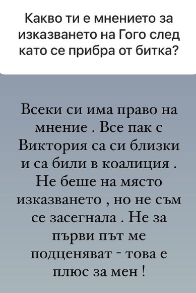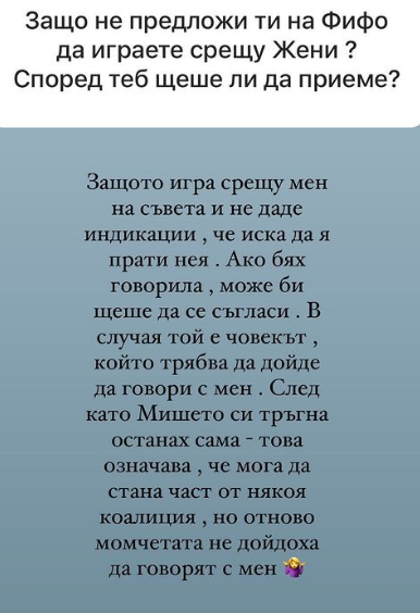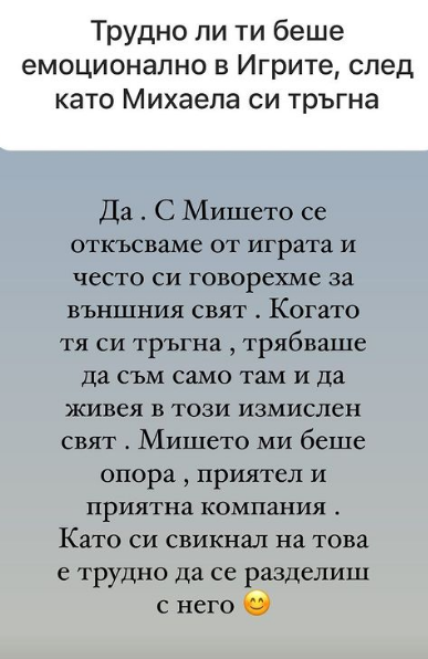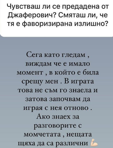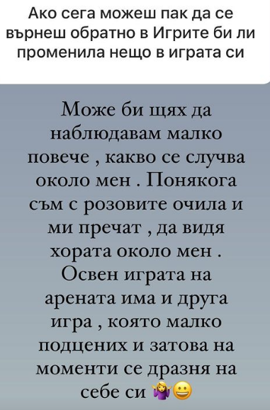 Същото си помислих, едно към едно. За всичко. За този пост, а и за онзи, в който казва, че ако е знаела за Евгения и мъжката коалиция /една от многото нейни/, да е играла по различен начин. Това не го казва за първи път. Е, добре, как след като най-добрата ти приятелка в играта е отстреляна от един човек, с който до момента сте били /уж/ и двете в комбина, ти очакваш от същия човек да не направи същото и с теб? Или поне да нямаш едно наум, поне едно? Женска гордост ли е, розови очила ли са, и тя беше от тези, които си казаха, че са там, “за да си играят на арената само“....ама все пак!