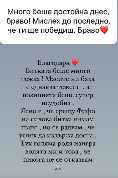 Миналата година Неделчо и Симеон нямаха дъска на гърба за помощ. Кръстовете им как не заминаха. Сега обаче май беше по-тежка масата. Наистина много трудна битка и Ралица беше близо до победа. Жалко, че не помогна на Лефтеров, но поне взе още грошове.
