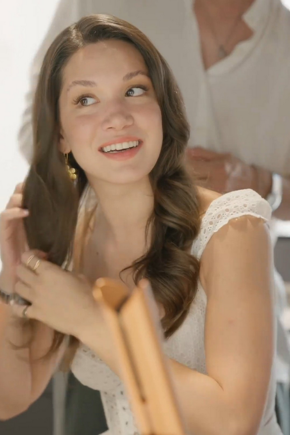 Ибрахим Зенгин лесно добавя безупречни щрихи към косата на Хазал благодарение на безжичното използване на пресата за коса Dyson Corrale."
