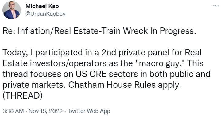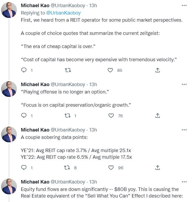Човекът е ходил на конференция на инвеститори в недвижими имоти и споделя какво е чул там. Откъде другаде можеш да научиш тези неща, освен ако не си платиш да идеш сам на конференцията? Във вестника със сигурност няма да ги прочетеш. Давам само един скрийншот, а който се интересува, нека чете когото си избере в Туитър (аз чета въпросния Майкъл, но нито рекламирам абонаменти, нито той продава нещо. Има много такива хора, които споделят знанието си безплатно - за който желае да ги следва.)