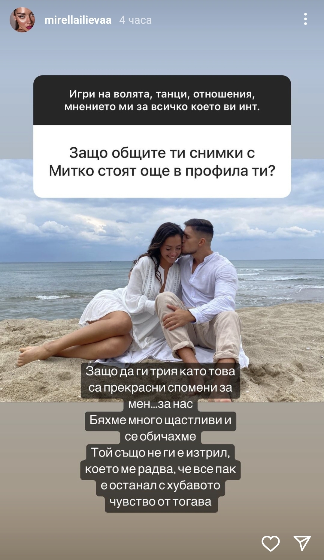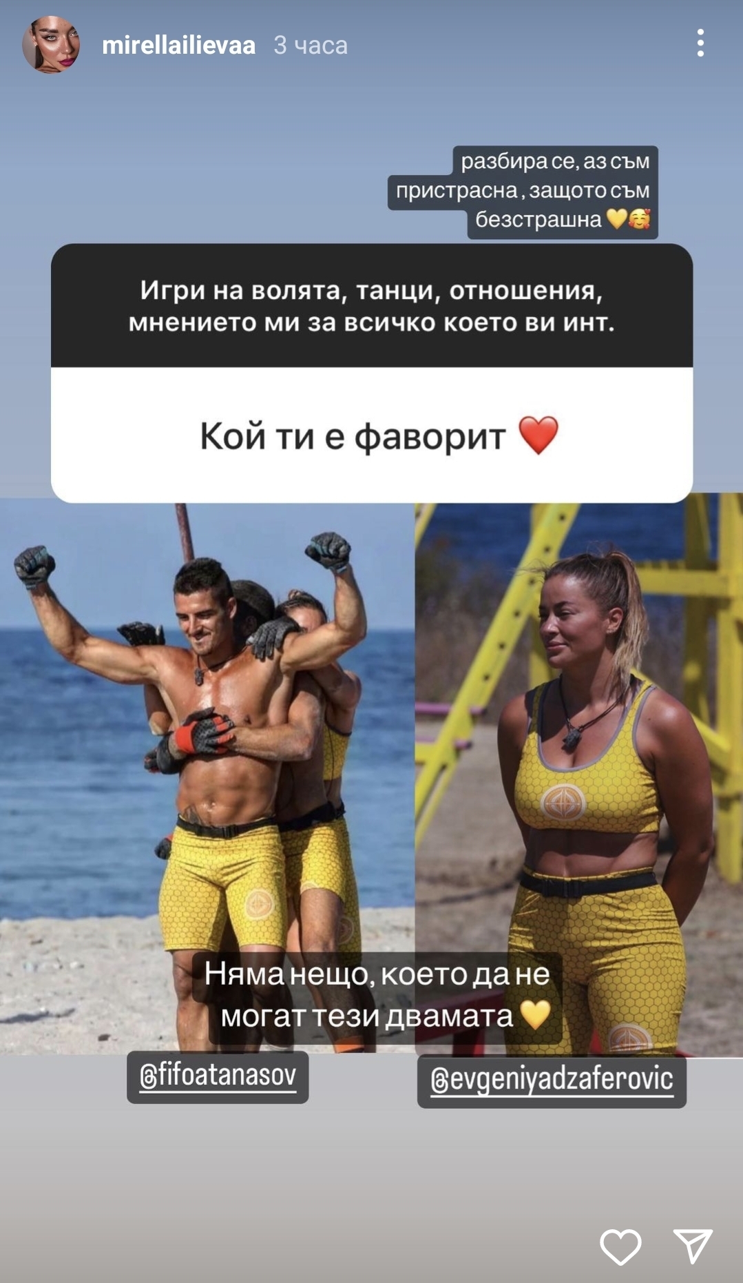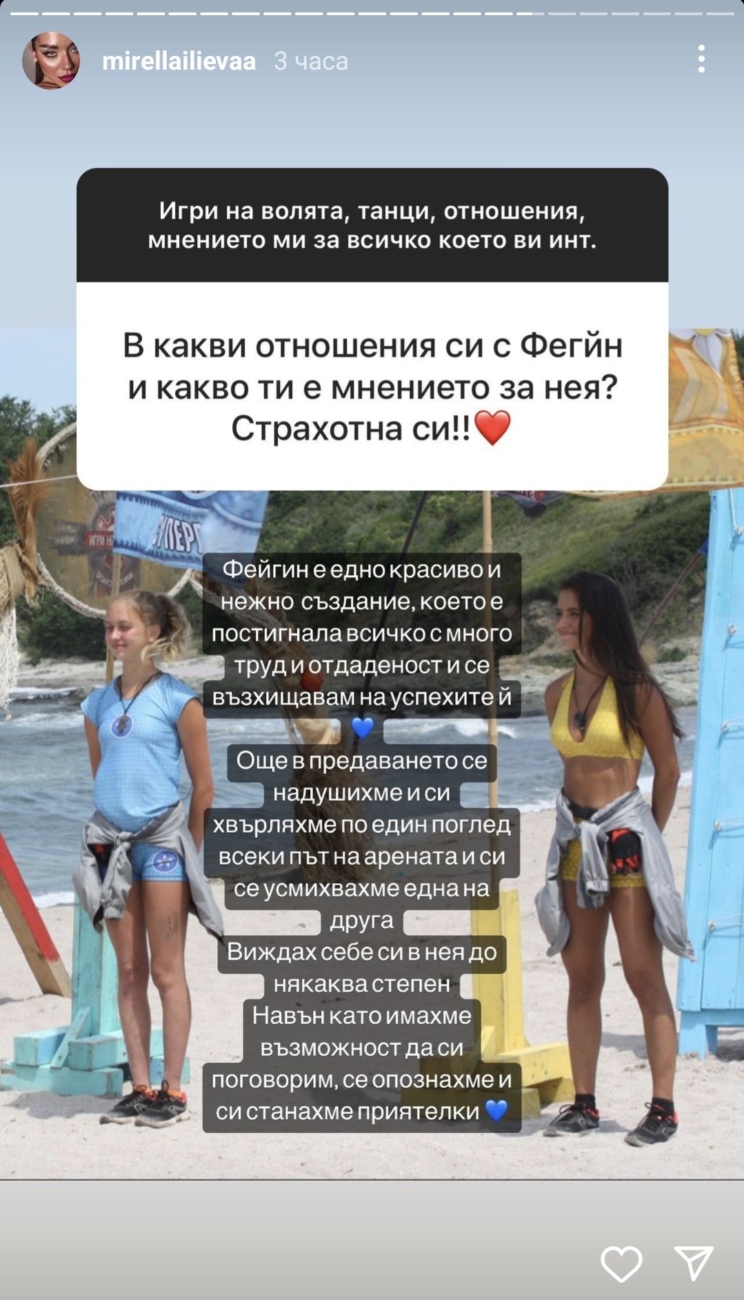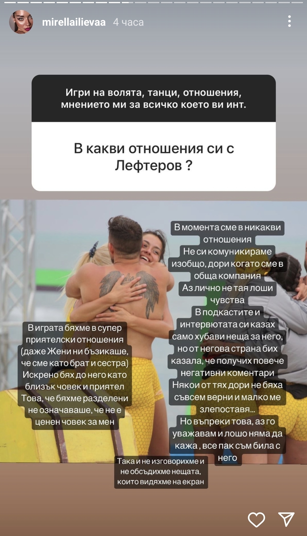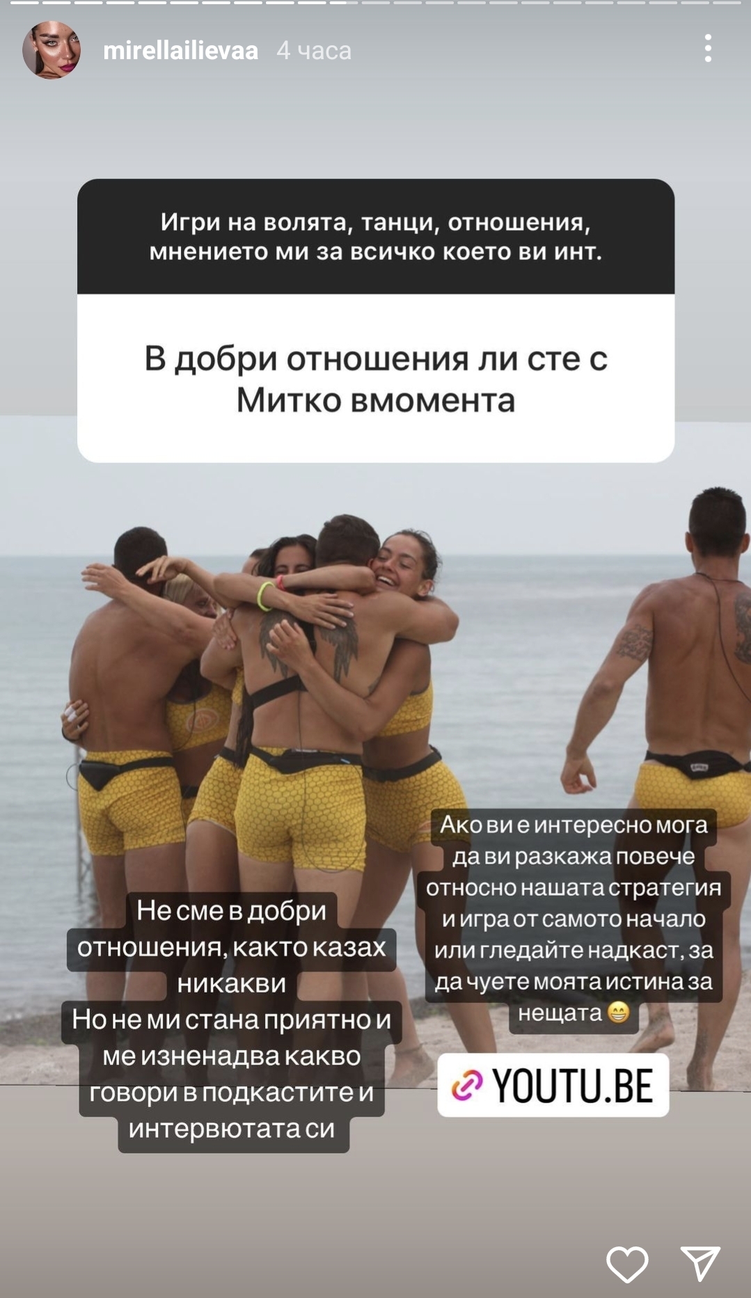 Мирела отговаря на въпроси - най-близка е с Жени и Илиян, не поддържа отношения с Лефтеров, въпреки че са били в добри такива преди формата и в него, сега не си говорят на събирания, фаворити са ѝ Жени и Филип: