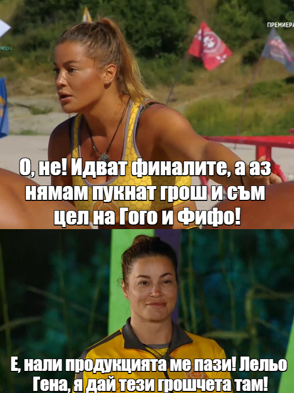 Лицемерно ми идва. Това вече е леля Гена, за която Кукув спомена в началото на сезона. Цял сезон леля Гена реве, че племето му се разделя на коалции около Елица, а после около Алекса - дразни се, раздава го тежко, натоварвало го било, а сега говори за Джаферович, че е от най-добрата, а тя прави същите подли номера като Елица/Алекса с коалиции и задкулисие.