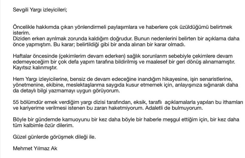 Мехмет е много талантлив, но ако наистина е постъпил така, това може да е пагубно за кариерата му (кой би му дал главна роля, ако има съмнение че отново би постъпил така). А посочените в първото изявление от продуцентите " здравословни причини" за напускането му (което Мехмет отрече в своя публикация) е било желание все пак да се избегне скандала и да се опази репутацията му