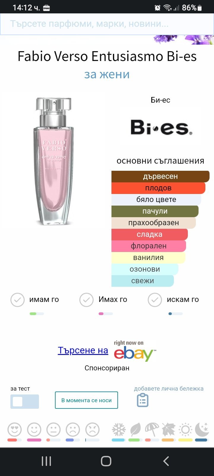 Между другото, тоя парфюм(Entusiasmo) съм го имала и няма отмирисване..... Толкова траен. Сравнявала съм го с оригинала, има голяма прилика, 90%,обаче му липсва една такава тънка горчивина от костилки, една изтънченост, която е в ориганала.... Версията остава някак по сладка