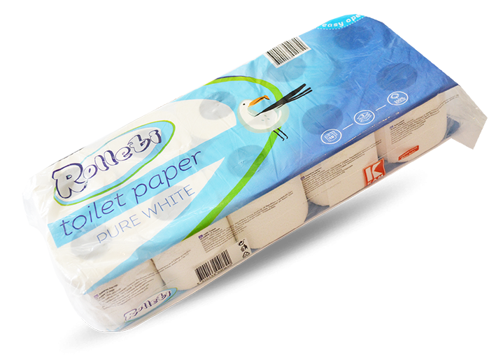 Дълъг, синьо с бяло плик,  с 2 реда  по 5 рула, 10 м, 3 пластова, 100 % целулоза, с означено място за отваряне, произведена в Сърбия. Надписът е :  Rolleti toilet paper pure white