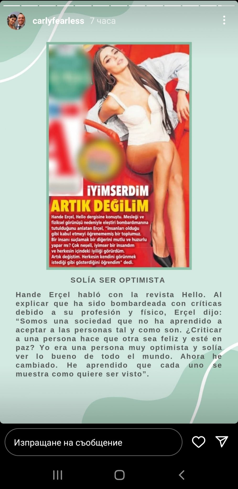 Ханде Ерчел ми беше познато име от "ласкавите коментари", с които отдавна е засипвана. Случайно попаднах на "Почукай на вратата ми", в момент, в който търсех нещо, което да ме откъсне от реалността поне за малко. След като изгледах първи епизод, реших да поразровя и видя коя в същност е тази девойка, за която не съм срещала критика само за начина, по който диша. Колкото повече четях за нея, толкова по-симпатична ми ставаше и печелеше уважението ми за начина, по който стои на краката си въпреки всичко, което се случва в живота й. Постепенно реших, че вместо да се информирам от коментари, искам да видя нещата, които публикува в нейните профили и я последвах. Дали съм нейн фен - не знам, но със сигурност Ханде Ерчел спечели уважението и симпатиите ми.