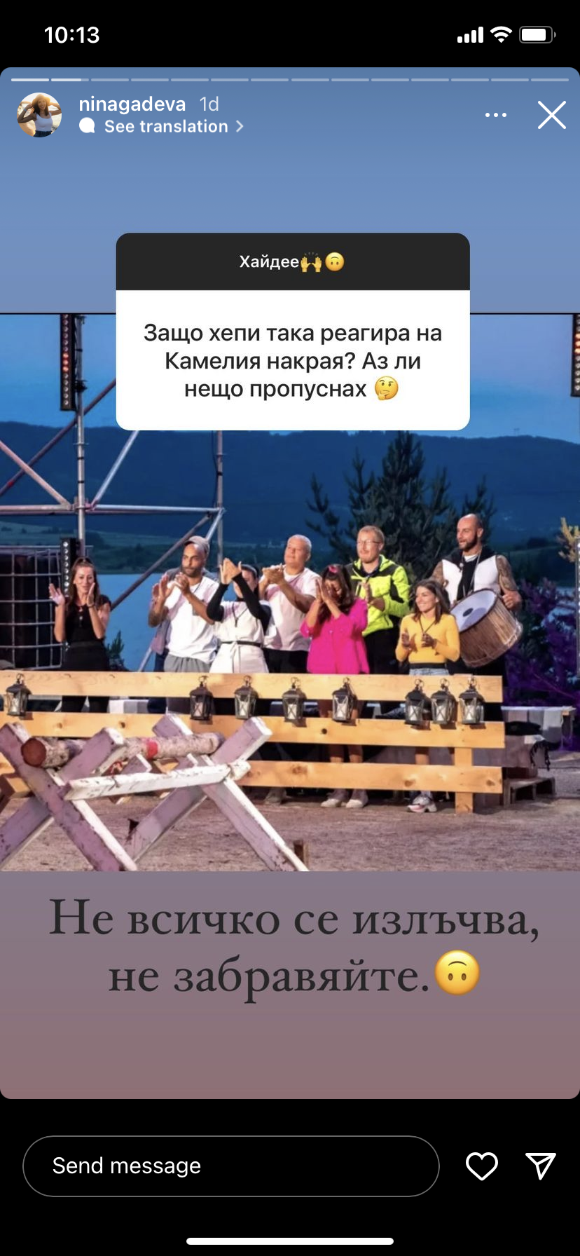 Веселка ме изпълни с жертвоготовността си. Просто е трудолюбива и не я бърка толкова. Явно е окуражила Нина в решението за ратай и браво на нея. Голяма душичка. Определено печели с тия неща, трудно е човек да се хване за каквото и да било в нейното представяне. Наистина браво на нея, а дори не ми е някаква голяма любимка, но няма как да кажеш на черното бяло.