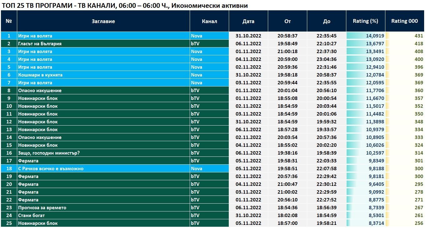 Дял на аудиторията и най-гледаните ТВ програми – седмица 44,  31 окт. – 6 ное. 2022г.