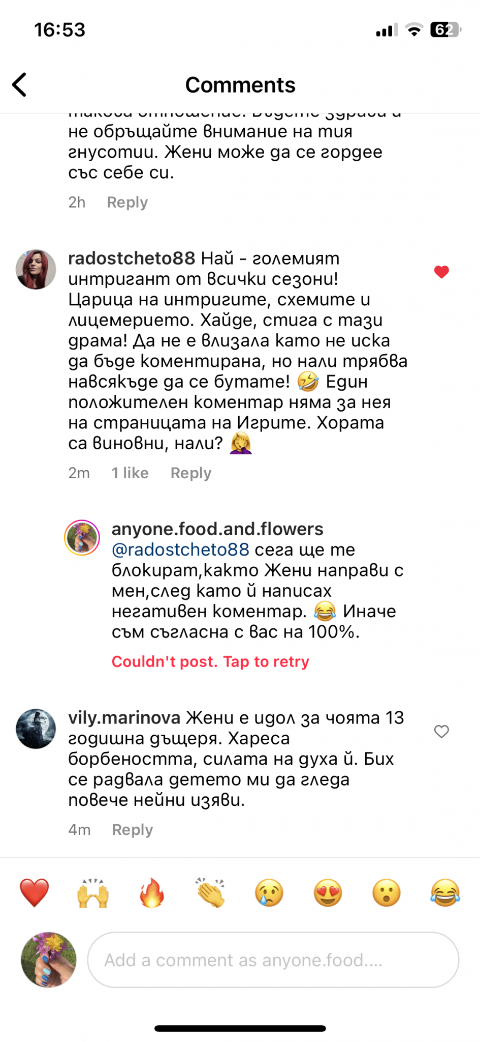Тъййй,и Ваня Джаферович с номерата на жена си. 😁 Един негативен коментар имаше и като опитах да напиша под него,вече беше изчезнал. Ами съжалявам,че са подложени на тормоз и хейт,не е редно,но тя какво очакваше? Да е мислила вътре като плете интригите и прави схемите. Че и написал Ваня какви деца възпитават хората,които ги хейтят. Ми те двамата какво правят?! Извинете,но реването сега ми идва в повече.