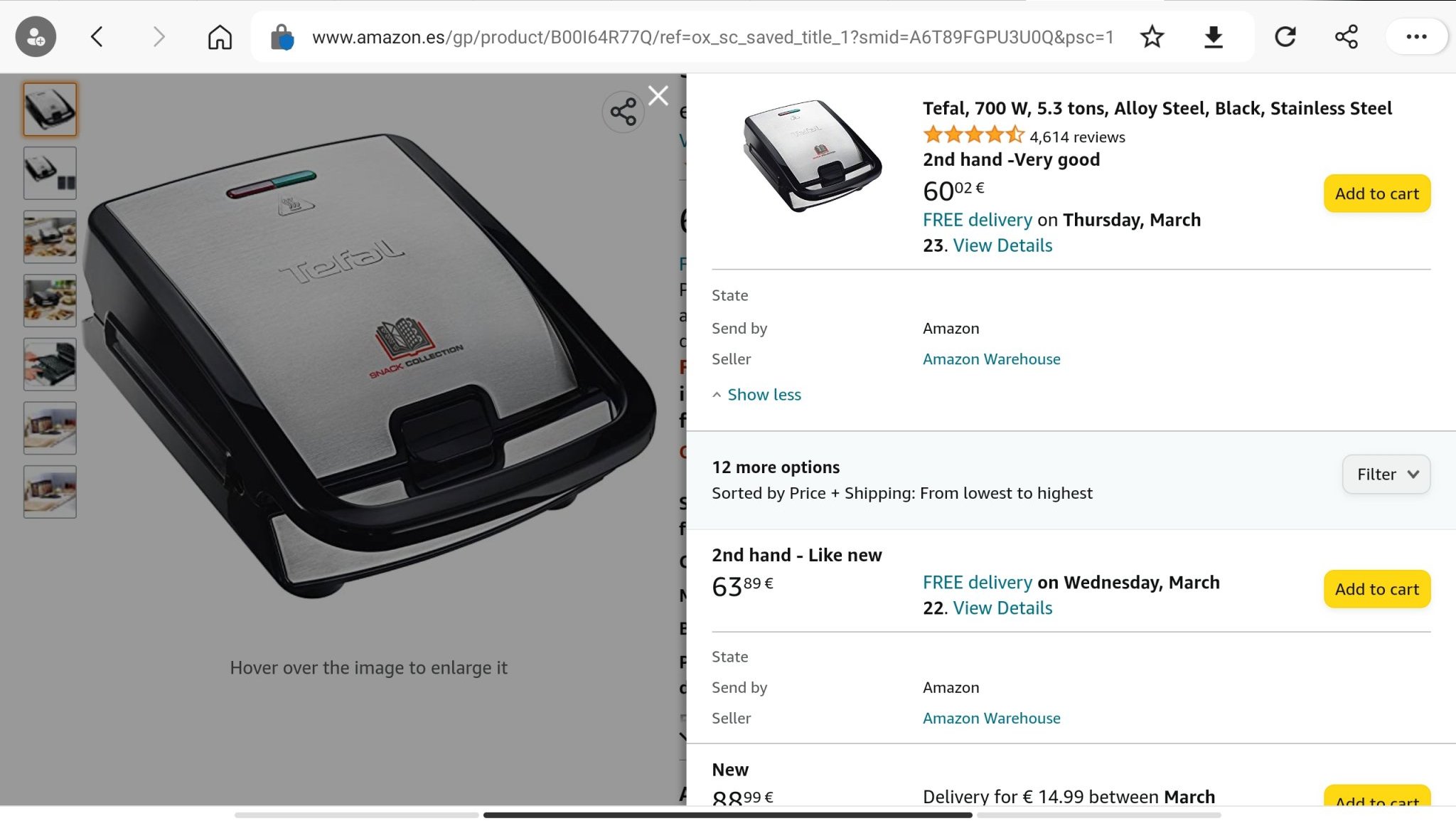 Тостерът на Tefal закупих от склада на испанския Амазон миналата година за 36 евро. Състояние много добро, но беше чисто нов.