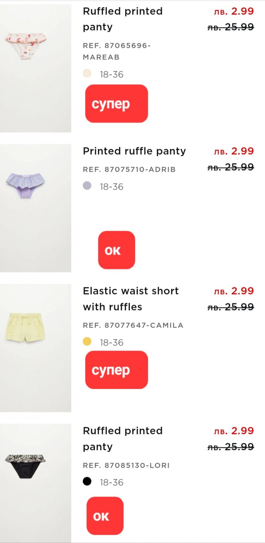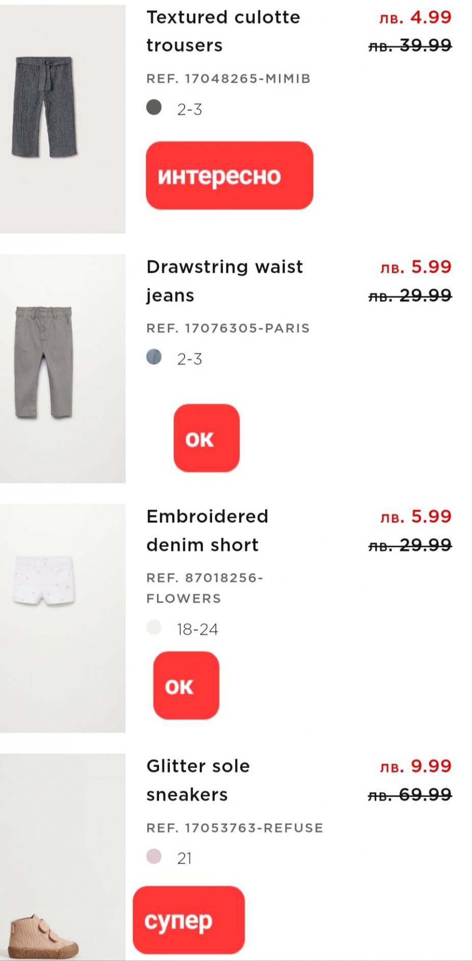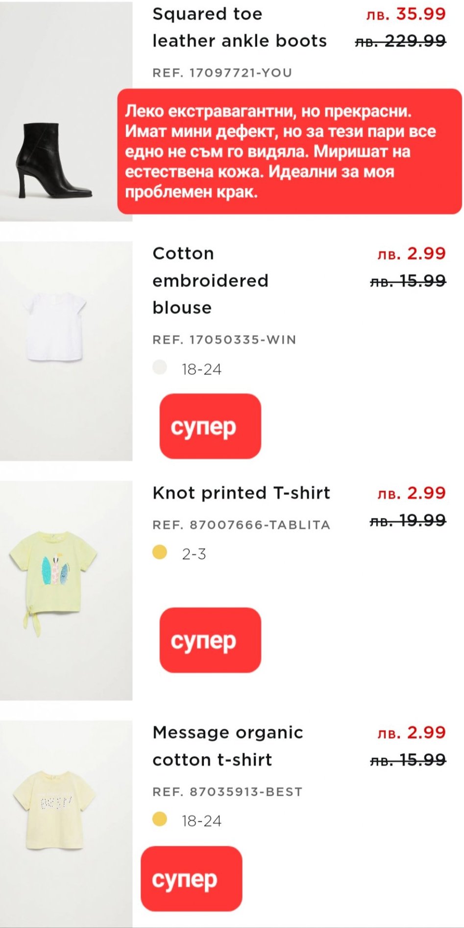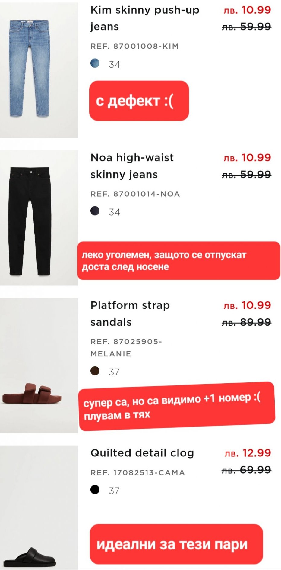 Дрехите са супер, особено за тези цени, но много от тях, или не ми/ни стават или не ми стоят добре на фигурата. И освен, че съм пръснала сума ти пари, накрая ме е и яд, че не ми стават. Просто онлайн пазаруването не е за мен. Уж да ми излезе по-евтино, а накрая като тегля чертата, по-добре да ида в мола и да си взема дънки за 50-60 лв, например.