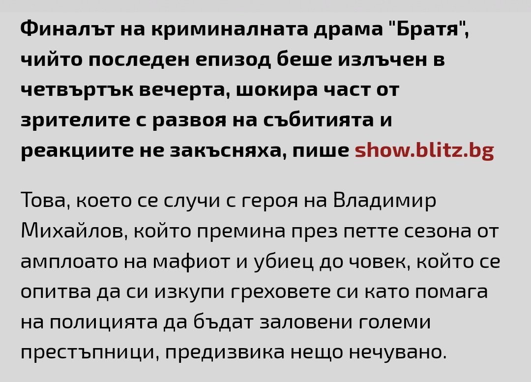 Владо как погледна, сякаш не можеше да повярва какво е станало, всичко стана толкова бързо... На мен пък ми е любим моментът след това, когато Денис посрещна Лора при излизането й от затвора, както й беше обещал.
