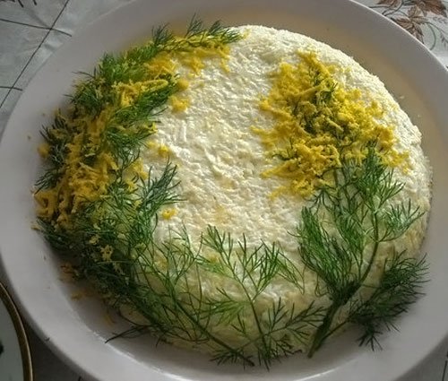 Картофите и морковите се сваряват в подсолена вода. След като са сварени, картофите се обелват, а морковите се остъргват с нож. Лукът се нарязва много ситно и се задушава в малко масло и олио докато омекне.н Шунката се нарязва на ситно. Сварените яйца се разполовяват и жълтъците се отделят за украса. Картофите, морковите и белтъците се настъргват, майонезата се смесва със заквасената сметана и пресования чесън, овкусява се с черен пипер и щипка сол. Започва сгобяването на салата. Може да сглобите салатата в стъклена купа, в сервирна чиния  или като ползвате ринг. В основата поставете настърганите картофи, а върху тях 2 с. л. от майонезата. Подредете слоевете – моркови, лук, шунка, белтъци, като върху всеки слой слагате по 2 с. л. майонеза за спойка и овкусявате с щипка прясно смлян черен пипер. Остатъкът от майонезата разпределете най-отгоре и заравнете. Украсете със стръкчета копър и натрошените жълтъци