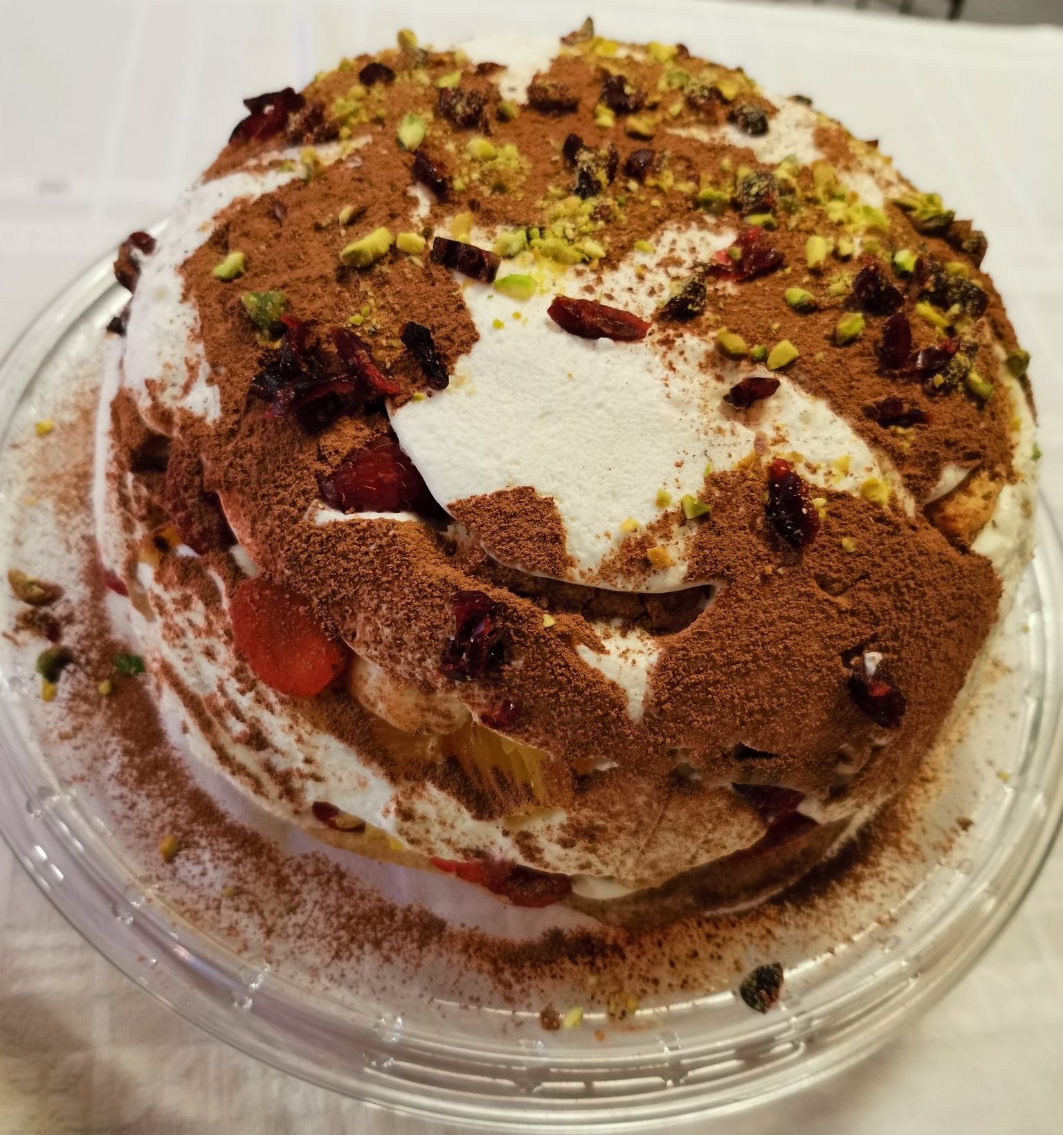 Взима се кръгла купа с диаметър 25 см., в която ще се сглобява тортата и върху хартия за печене се очертава обиколката ѝ. По очертанията се разпределя 1/2 от белтъчния крем и се пече 25 минути до готовност, докато добие златист загар и леко се сниши.
