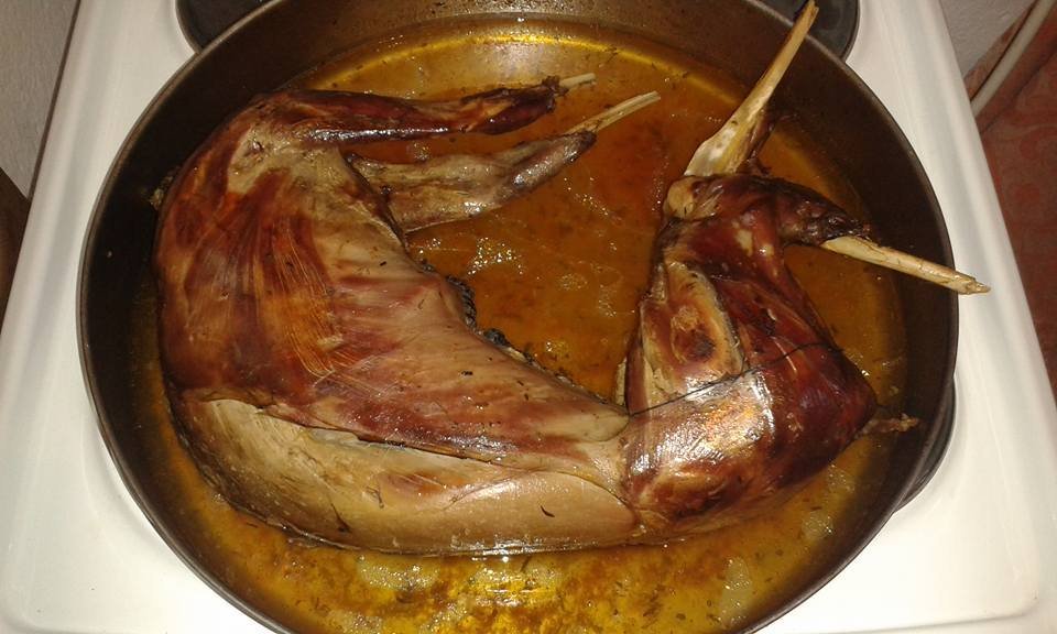 Продукти: 1 цял заек,300гр.ориз,1 връзка лук,магданоз,заешките дреболии,сол,чубрика,червен пипер,черен пипер,олио. Заекът се изкисва във вода и оцет,за 24 часа,като 2 пъти сме сменяли водата.Приготвяне:Нарязвам на дребно дреболиите,запържвам ги,след това добавям лукът и магданозът,запържвам още 5-10минути,след което добавям и оризът.Позапържвам още 5-10минути и свалям от котлона.С една лъжица сол,натривам заека отвътре,след което го напълвам с плънката.Зашивам и поставям да ври в гореща вода, за 1:30 минути в тенджера,като ври 45 минути от едната страна и 45 минути от другата страна. След това го слагам в тава,с 1-2 литра вода и пека под фолио.Като мине 1 час,махам фолиото,обръщам го,слагам ново фолио и пека още 1 час.Накрая дегустираме с ракия и салата.