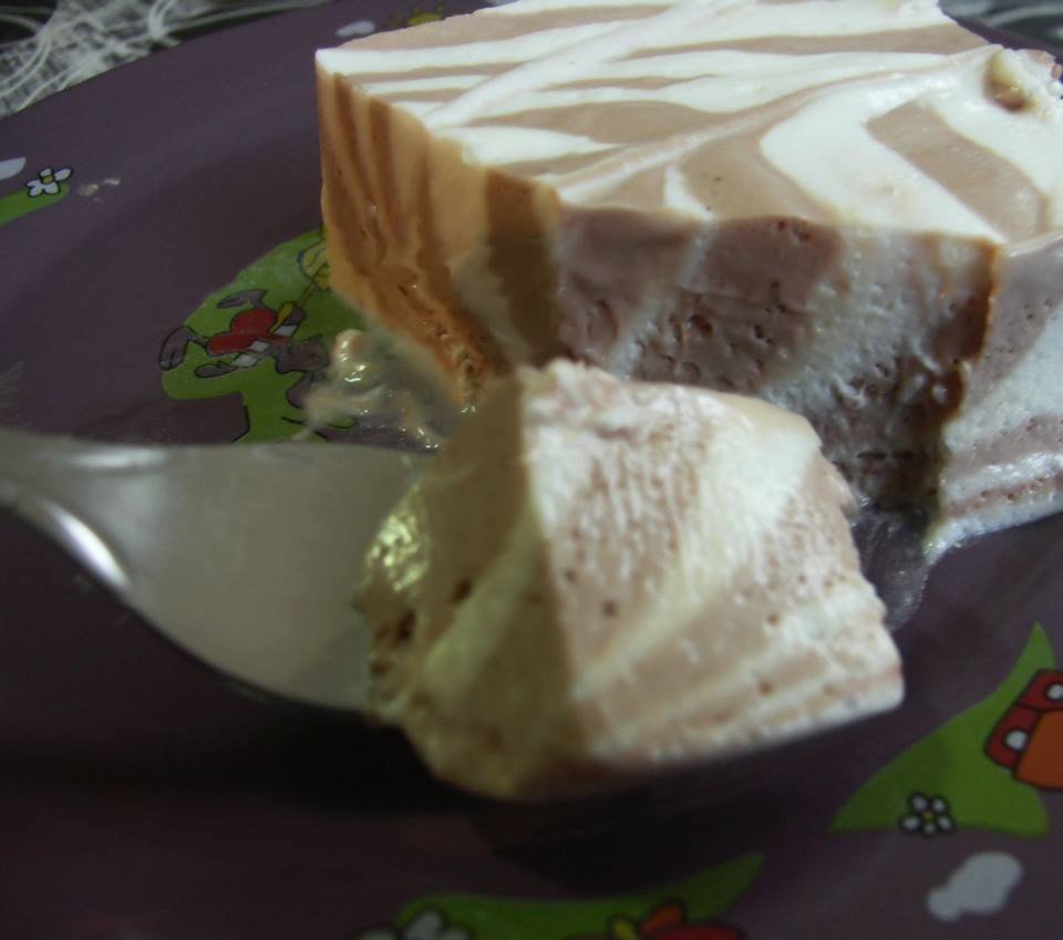 В разтваряща се форма с диаметър 22-24 см започват да се сипват по 4-5 лъжици от бялата смес в средата, след това в средата, върху бялата смес 4-5 с.л. от кафявата смес и така се редуват докато свършат и двата крема. Оставя се в хладилника за едно денонощие да стегне.