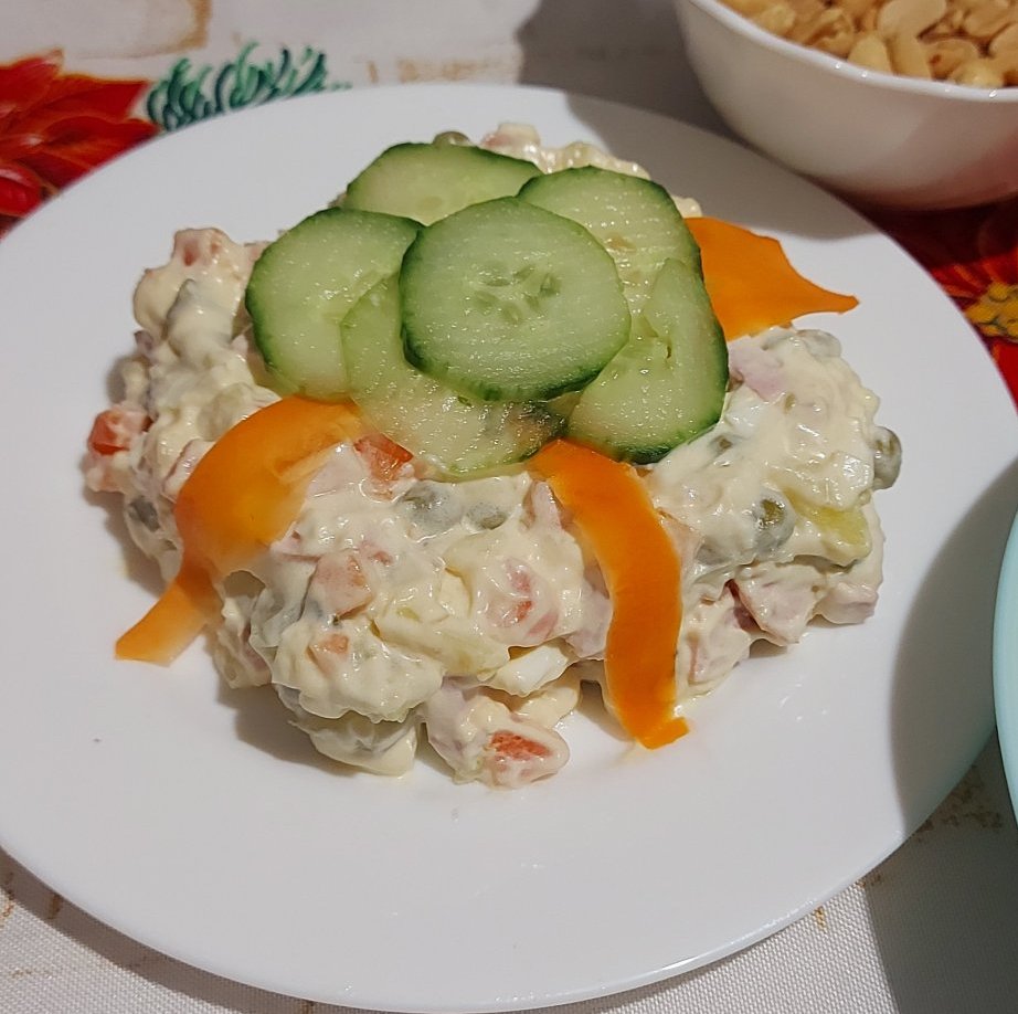Картофите, яйцата, морковите и граха се сваряват. Всички продукти се режат на кубчета и накрая се смесват с майонезата.