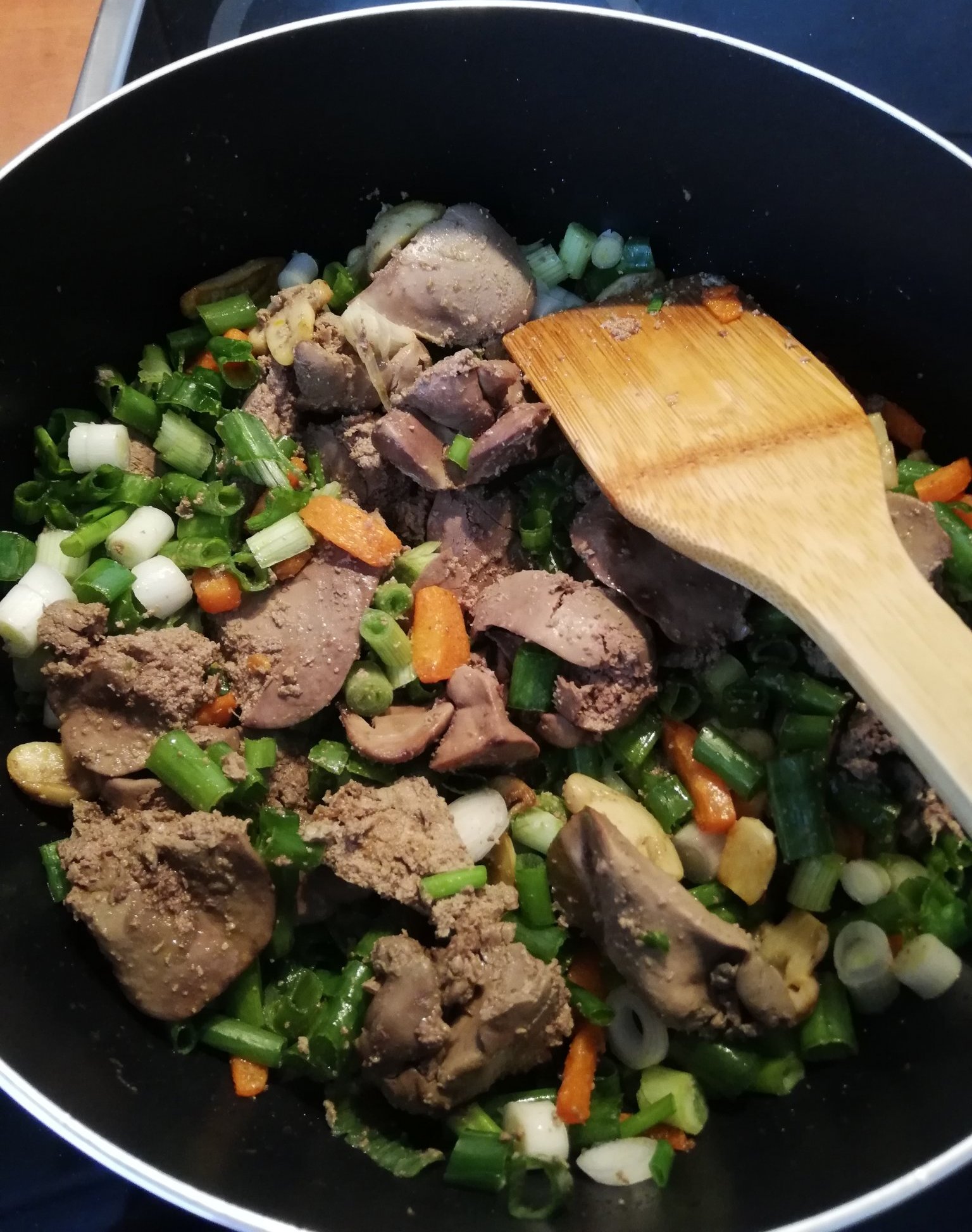 Поставамя дробчетата в 1л.прясно мляко, за да се стегнат и да не се пръскат при пържене. След няколко часа изваждаме и измиваме. В голям тиган слагаме морковите, зеленият лук и гъбите. Пържим 20 минути в маслото, след което добавяме дробчетата. Пържим така 10 минути и добавяме подправките. Допържваме още 10-15 минути или по наше желание.