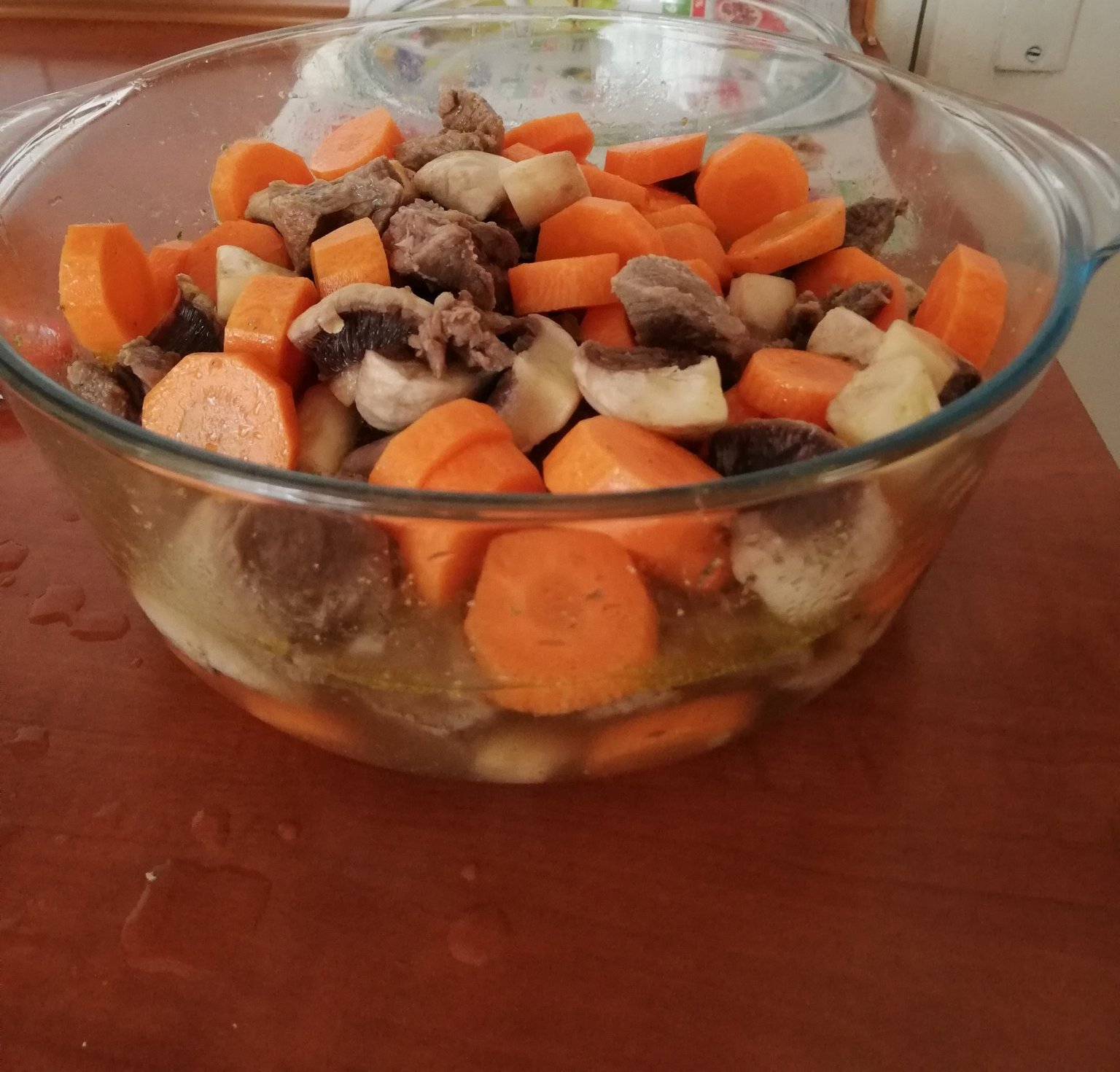 Нарязваме телешкото на малки парчета, които начукваме с дървен чук. Поставяме в прясно мляко, за да поомекне. Може да се държи от 2 до 12 часа в хладилник. След като престои нужното време, изваждаме и измиваме. В стъклена тенджера/йенска/, поставяме измитите, почистени и нарязани гъби и моркови. Добавяме месото,солта и олиото. Наливаме 1 литър вода. Слагаме във фурна за 1 час, на 170 градуса.