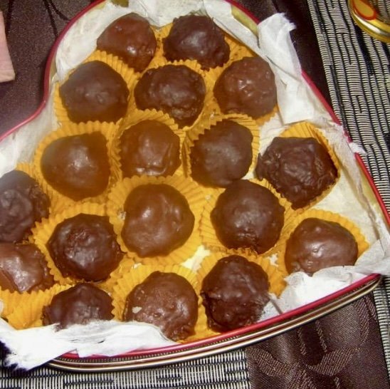 Общо взето всичко е на око- натрошени бисквити, ядки( орехи, лешници) сушени плодове ( стафиди, кайсии, череши), портокалови корички. Разбивам в блендъра, като ползвам меко масло Президент за оформяне. Разтопявам шоколадов кувертюр с масло и потапям бонбоните.Редя  на решетка и на студено за да се втвърдят