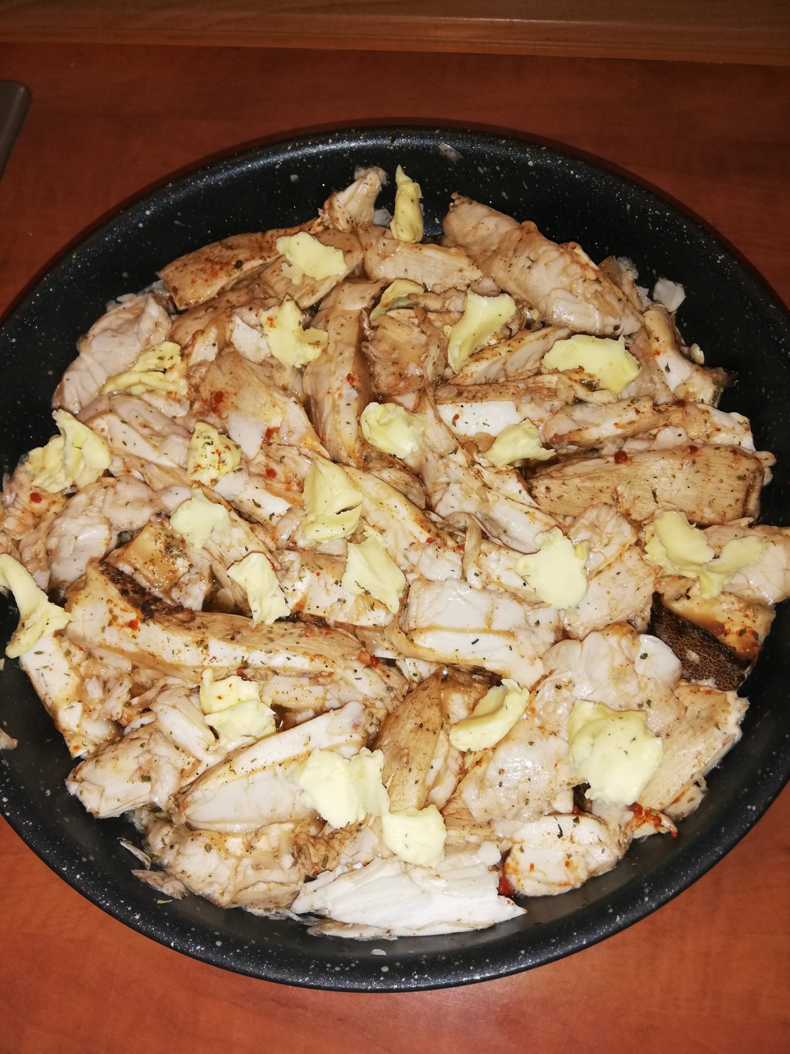 Отгоре поставяме кръгчета от топеното пушено сирене и парченца от кравето масло.