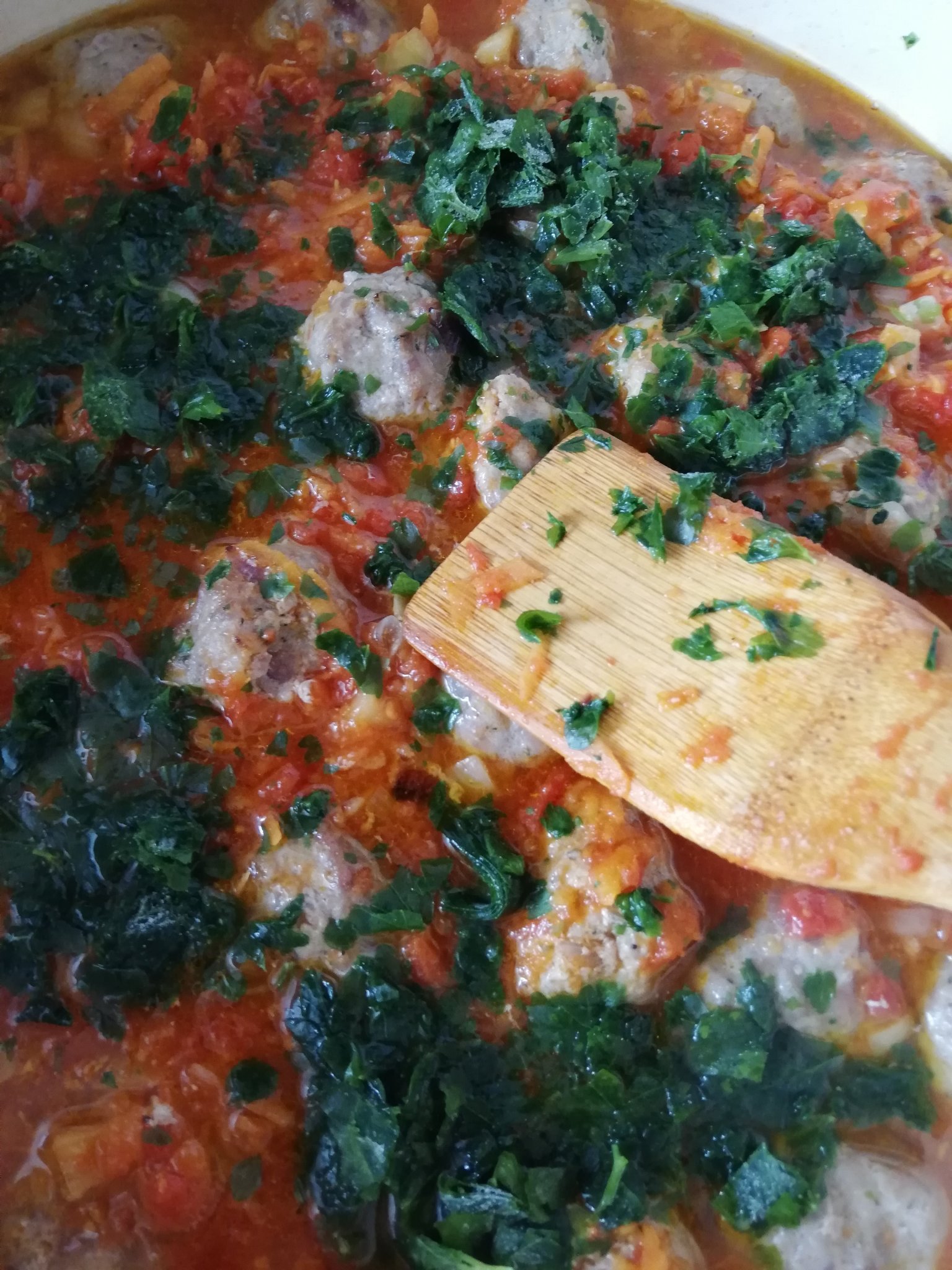 От каймата правим малки кюфтета, които пържим в олио или масло Президент . След което, в голяма тава слагаме :нарязният на полумесеци лук, настърганите домати, моркови и добавяме към тях подправките. Добавяме кюфтетата и част от мазнината, в която са се пържили. Оставяме да се пече във фурна, за 30-40 минути, загънато с фолио. След което отстраняваме фолиото и оставяме да ври, докато се изпари една част от доматите. Когато е готово, добавяме нарязният на ситно магданоз.