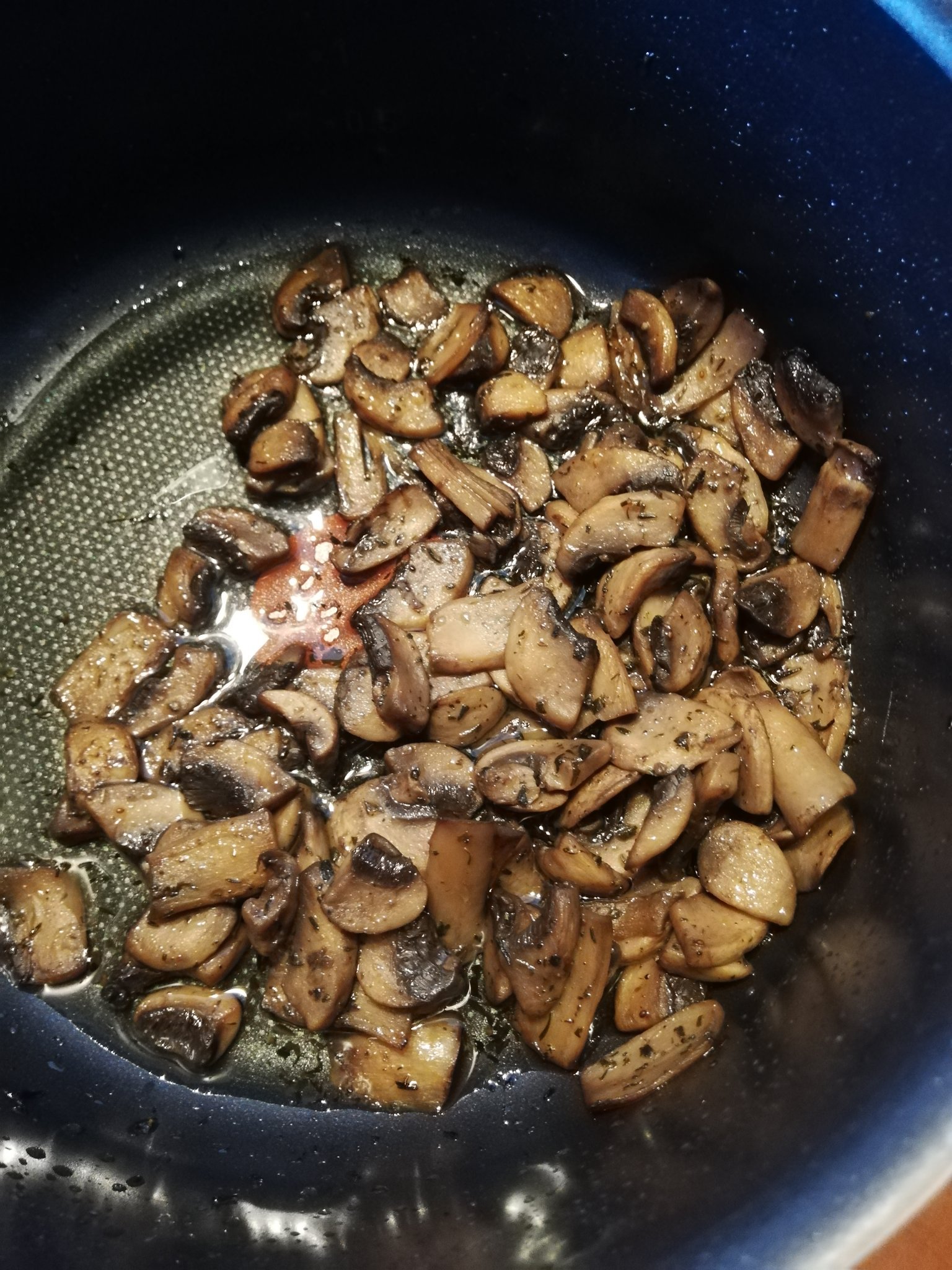 Почистваме гъбите и ги нарязваме на дълго.Добавяме подправките и маслото/както се вижда на снимката, съм го сложила на доста места, а не разтопено /. Добавяме 200мл вино или вода, покривам е със фолио и печем 40минути. След това махаме фолиото и запичаме. Идеалното мезе, за Бяло вино.🥂