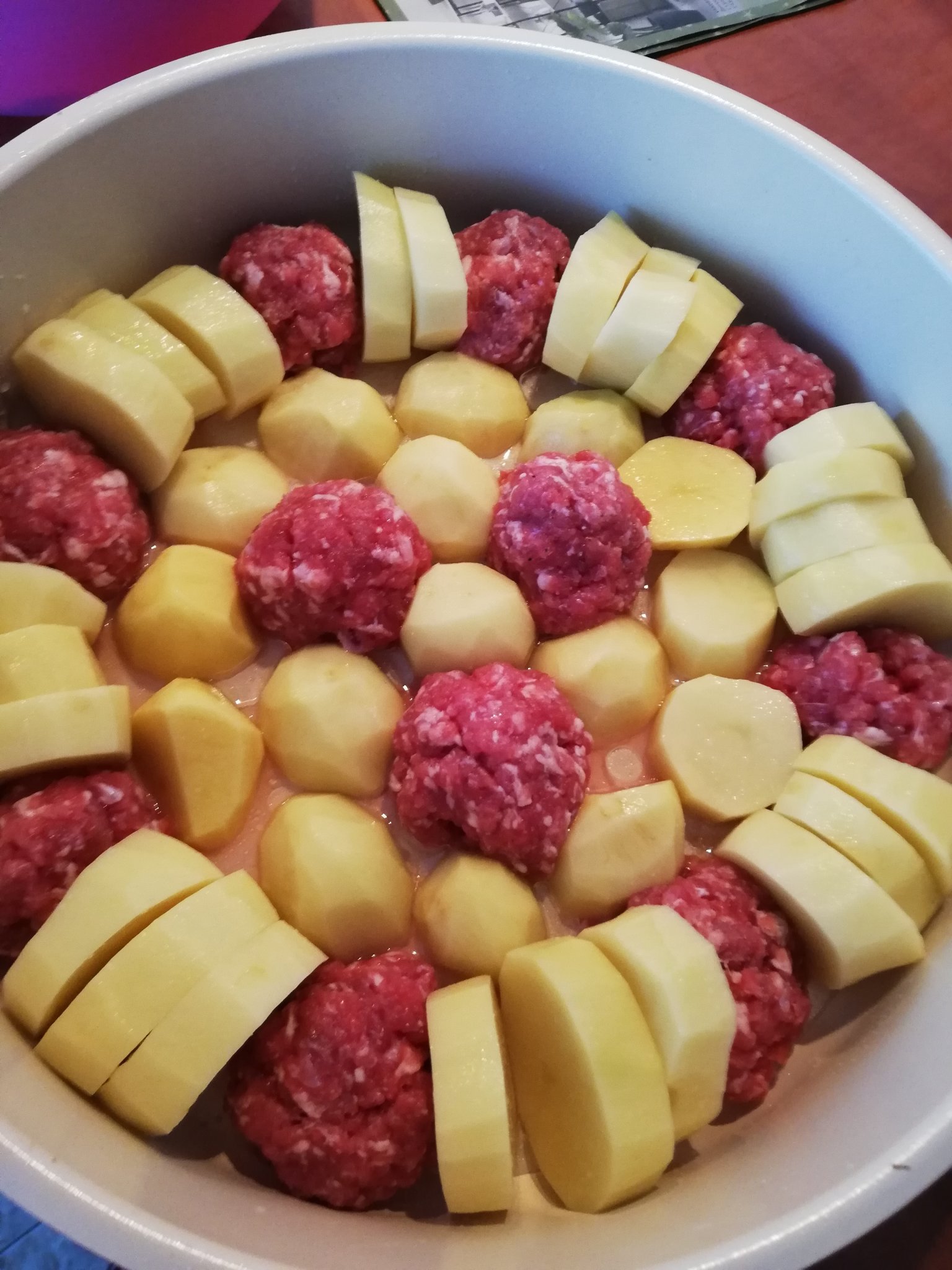 Както се вижда на снимката, много просто и семпло ястие, но за сметка на това уникално. Правим си кюфтета, нареждаме в тава, като редуваме с картофи. Наливаме 500мл.вода, отгоре посоляваме и съмсем леко намазвам с олио. Печем до готовност - аз лично обичам по препечено.