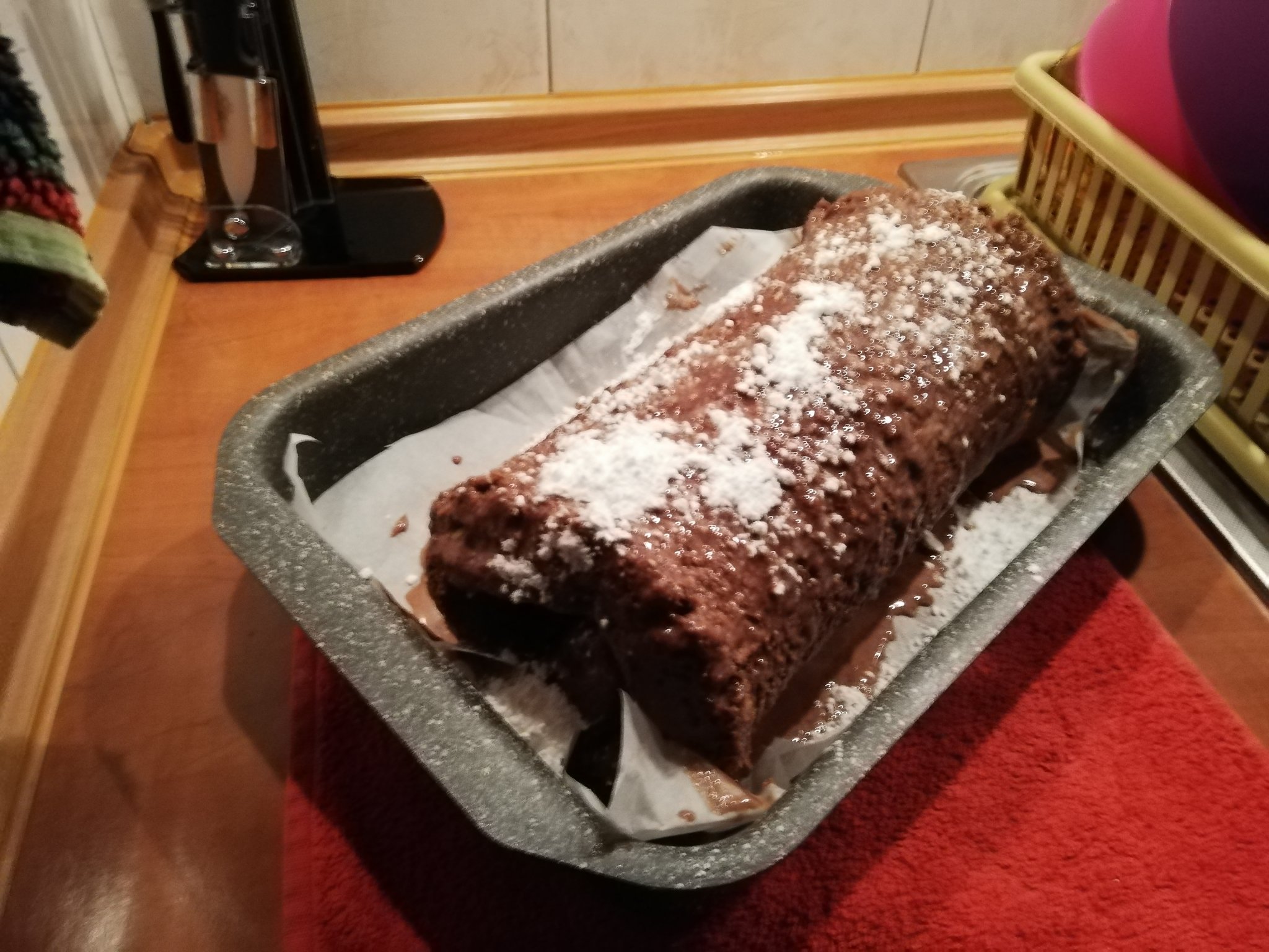 Разделяме белтъците от жълтъците. Жълтъците разбиваме с 1/2 (половин) ч. ч. захар, а с белтъците останалата 1ч.ч.( цяла чаша). Прибавяме разбитите белтъци към жълтъци, като бъркаме с дървена лъжица, за да не спадне сместа. Започваме да добавяме внимателно, пресятото брашно, към което сме прибавили ванилията и бакпулвера. След това добавяме и какаото.Печем на 170 градуса, като със шиш за барбекю, проверяваме дали е готово/щом не залепва по шиша, значи е готово/. Изваждаме и изчакваме да изстине малко. В купа изсипваме домашното сладко/конфитюр/мармалад/шоколад и добавяме разтопеното масло. Със тази смес, намазваме блата, след което навиваме на руло. По желание може да поръсите пудра захар отгоре.