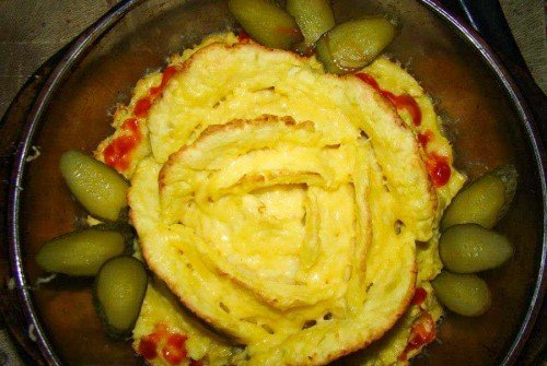 С мокри ръце се оформят на питки и се залепят към конуса от пюре последователно, като леко се застъпват, а краищата се извиват леко навън.