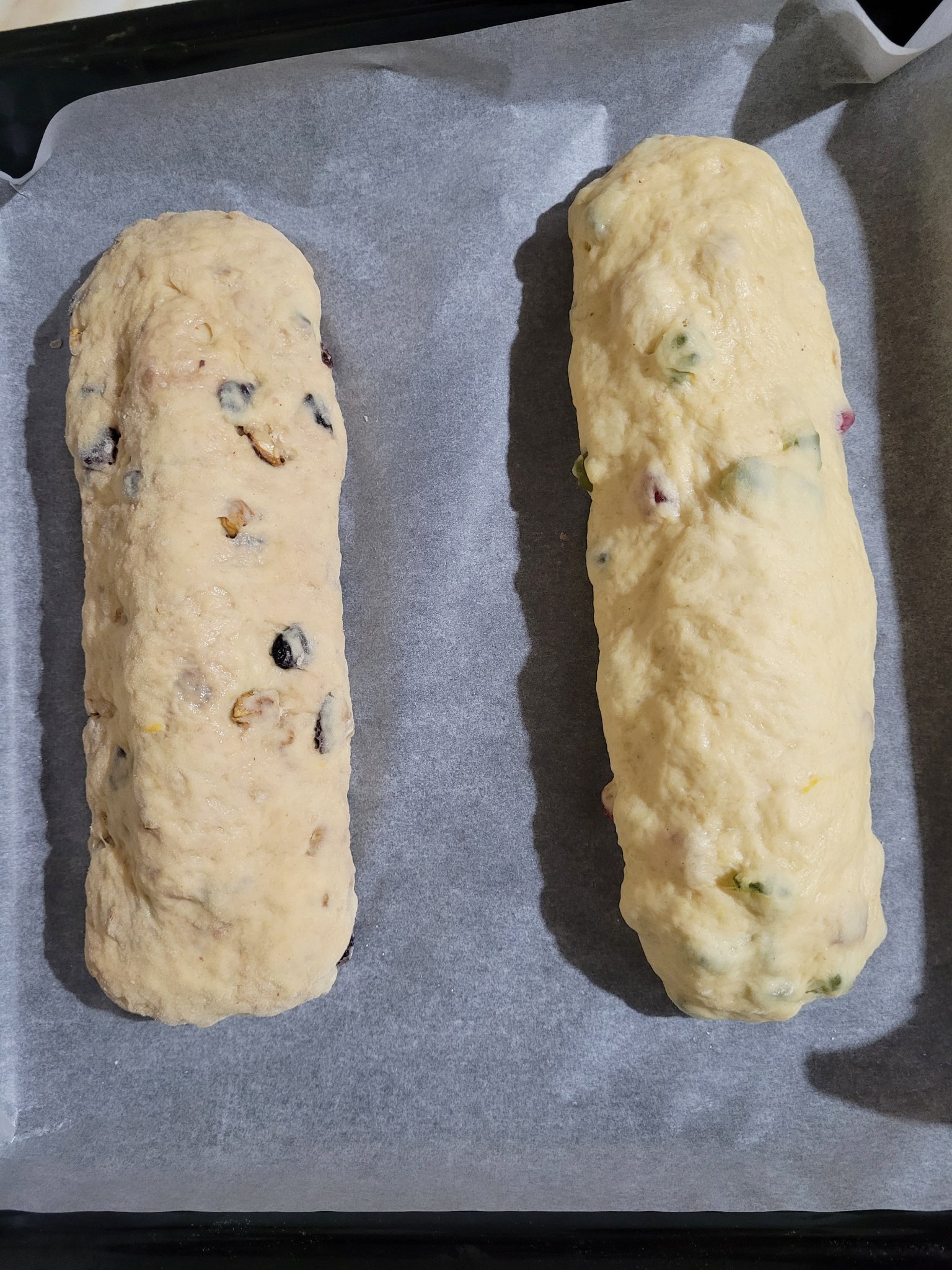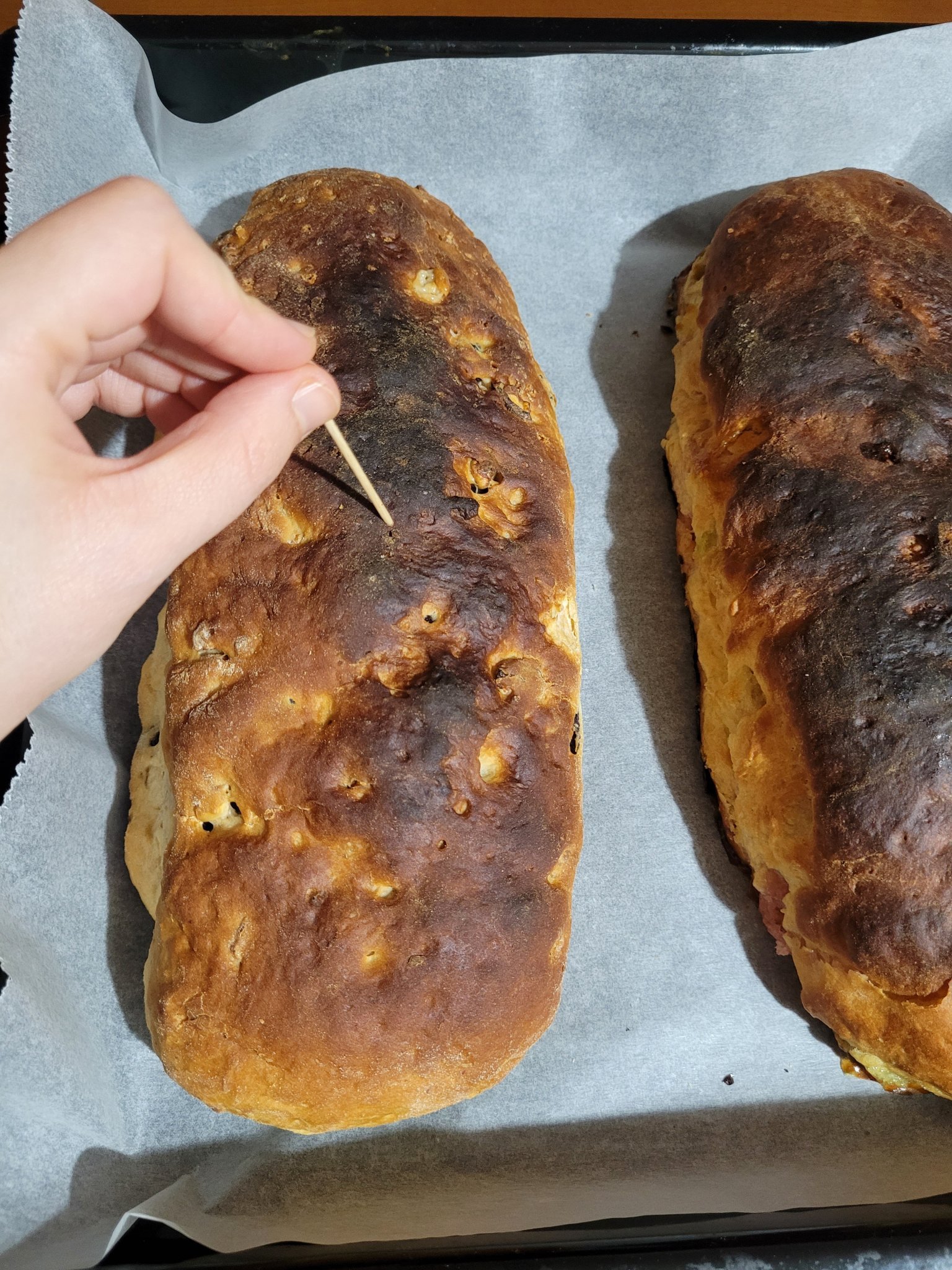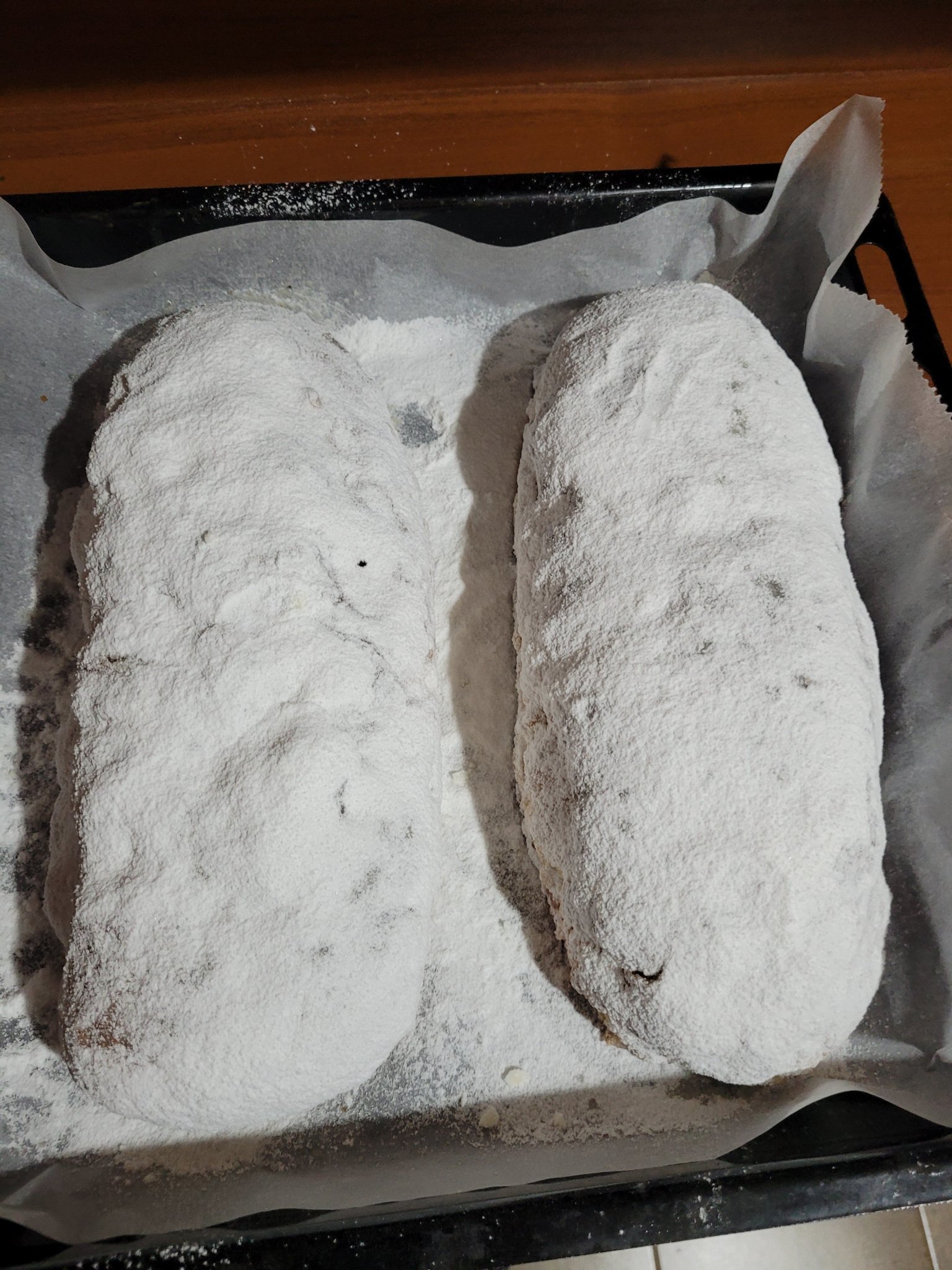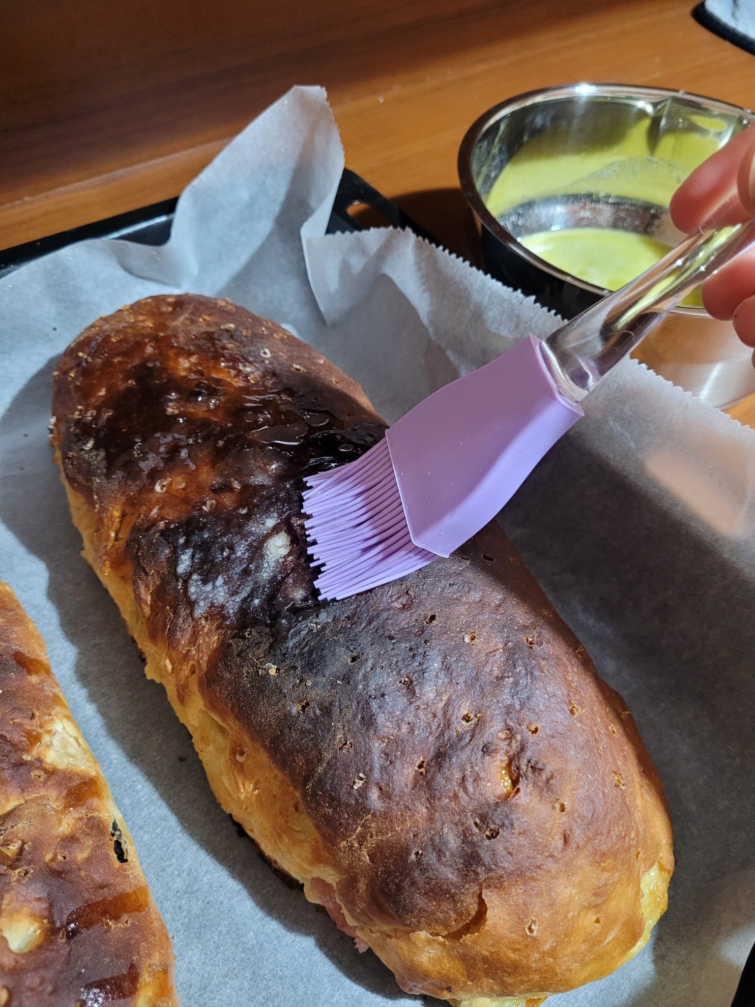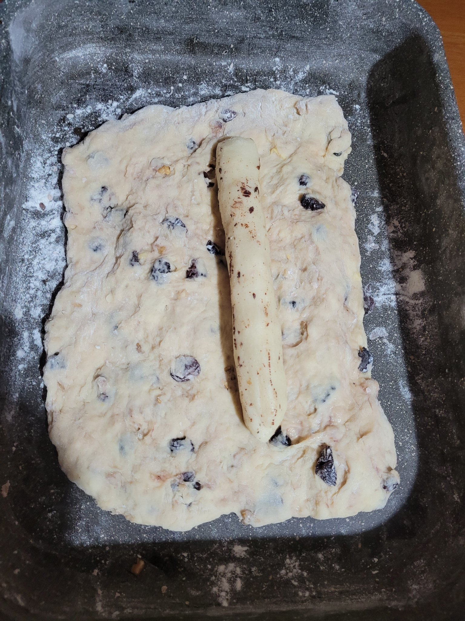 6. Разделяме тестото на две. Всяка част разстиламе на правоъгълна кора и в центъра слагаме марципан и след това завиваме. Полученото руло оформяме, за да придобие формата на хляб.