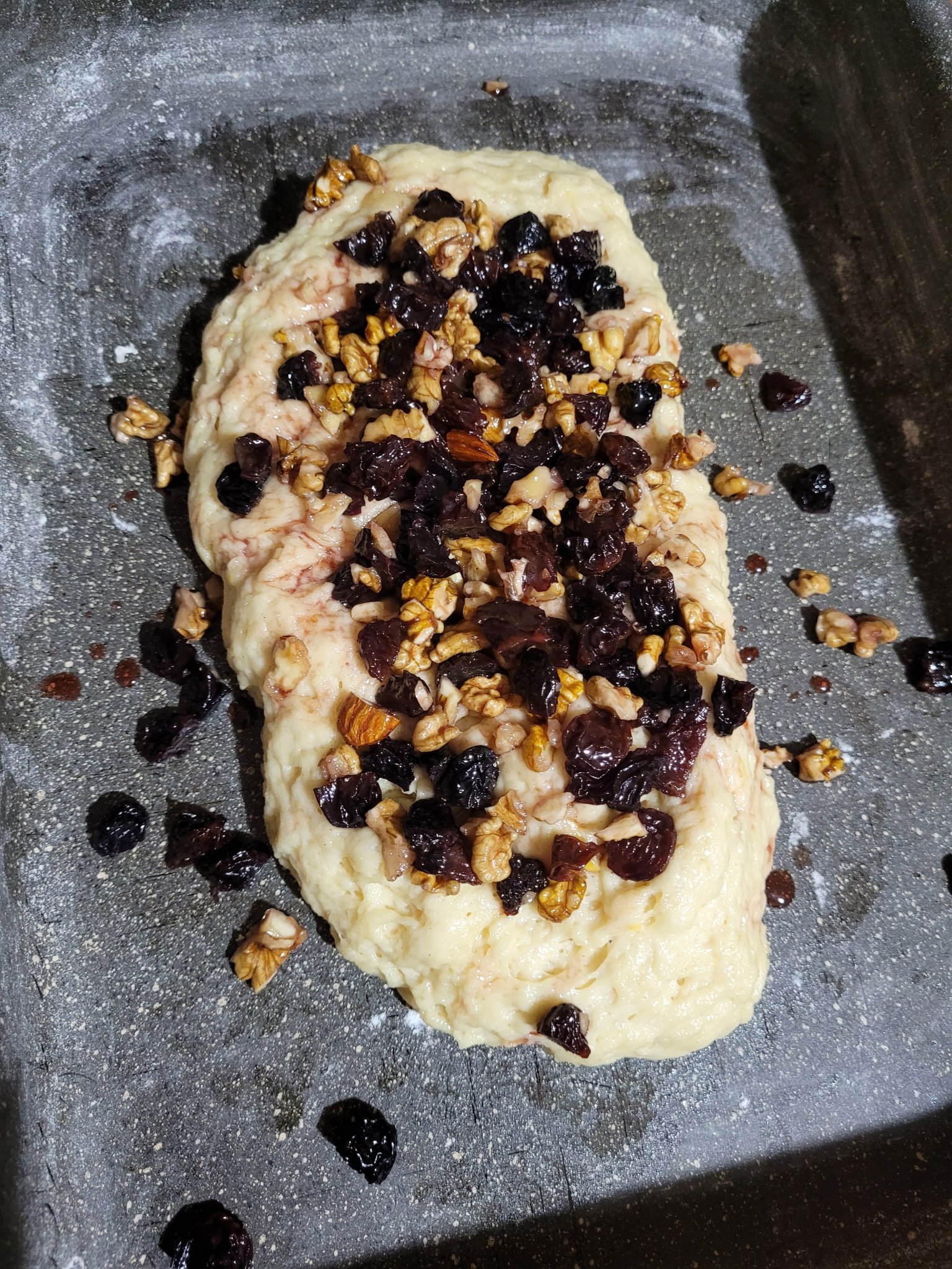 5. Към втасалото тесто добавяме отцедените сушени плодове и доомесваме. Може да е необходимо добавянето на още малко брашно.