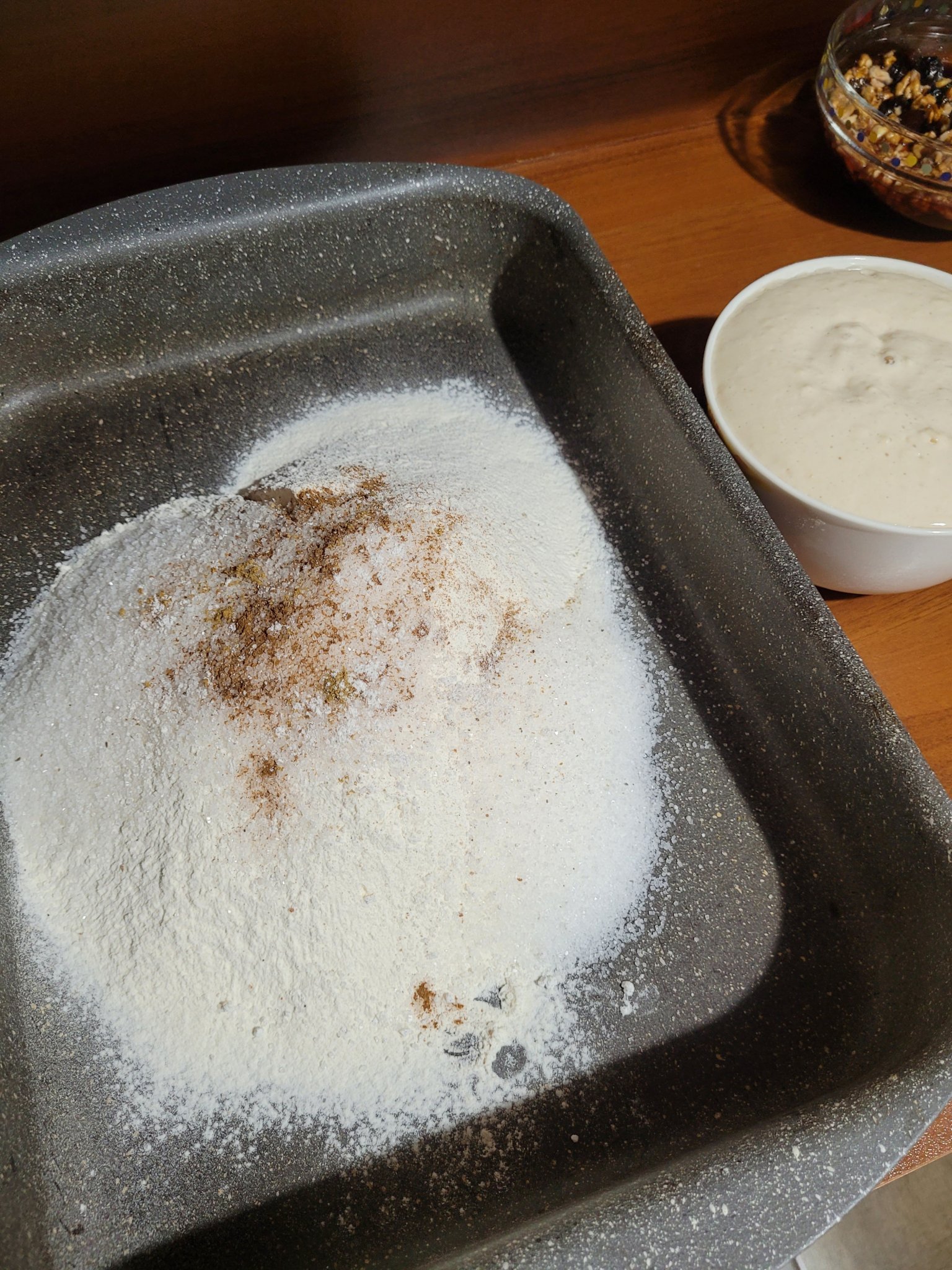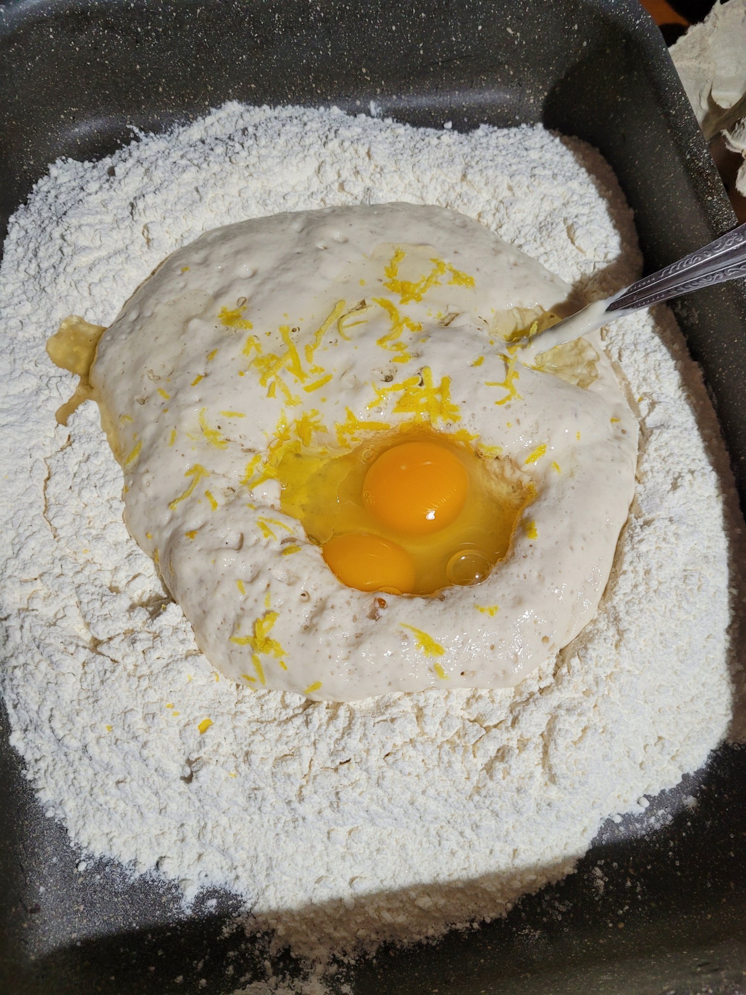 3. Пресяваме останалото брашно и към него прибавяме сухите съставки(захарта, подправите и кората от лимон), готовата мая и яйцата.