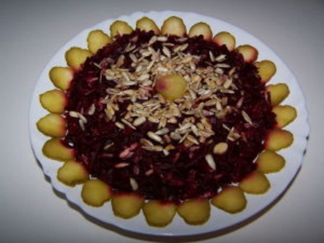 цвекло, чесън, кисели краставички, слънчогледови семки, олио, сол