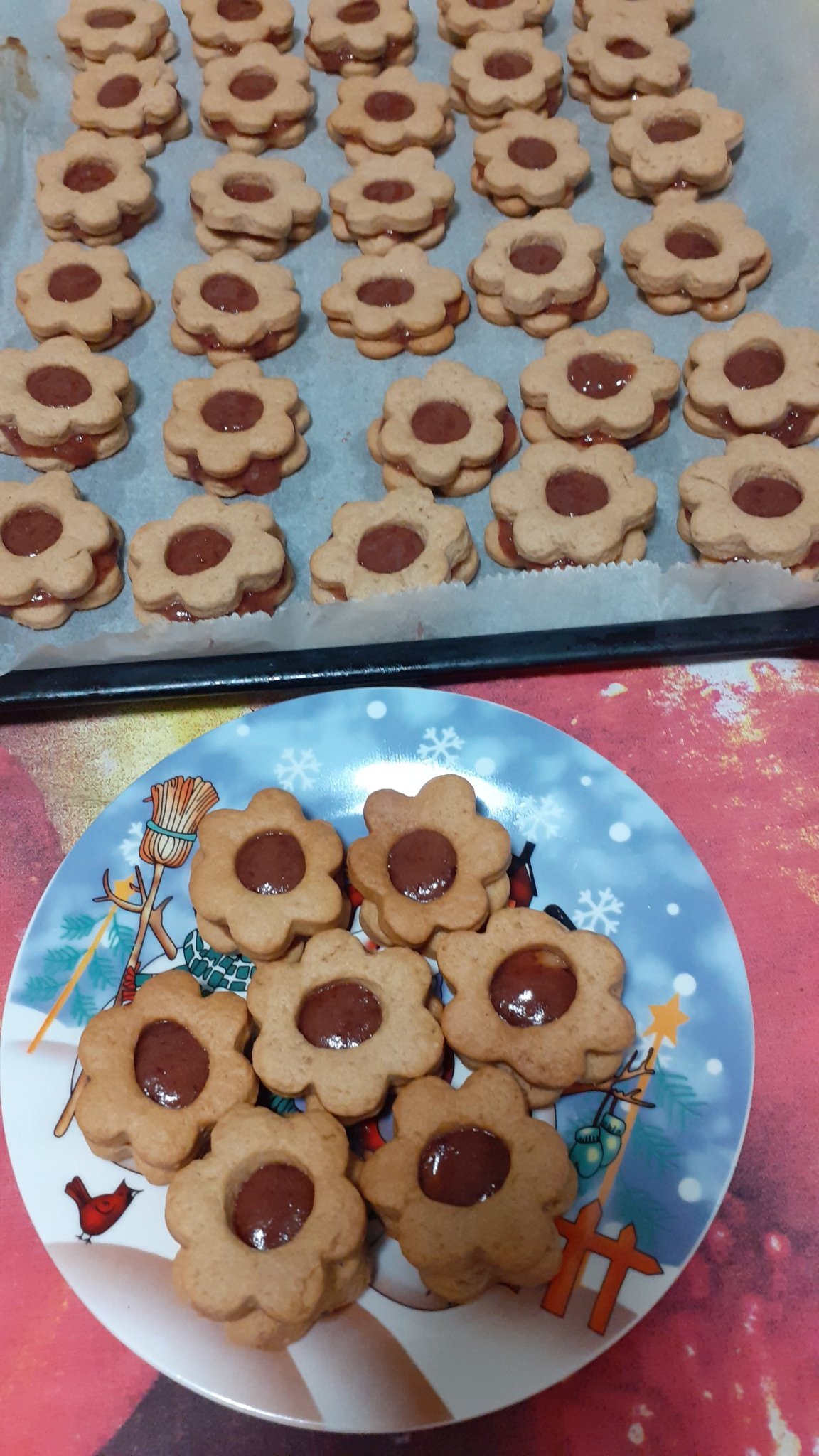 От всички продукти се омесва меко нелепнещо тесто. Разточва се кора, от която се изрязват кръгли сладки-на половината се изрязват дупка в средата. Изпичат се върху хартия за около 7-8 мин. при 180°С. Изстинали се слепват с мармалад по желание.