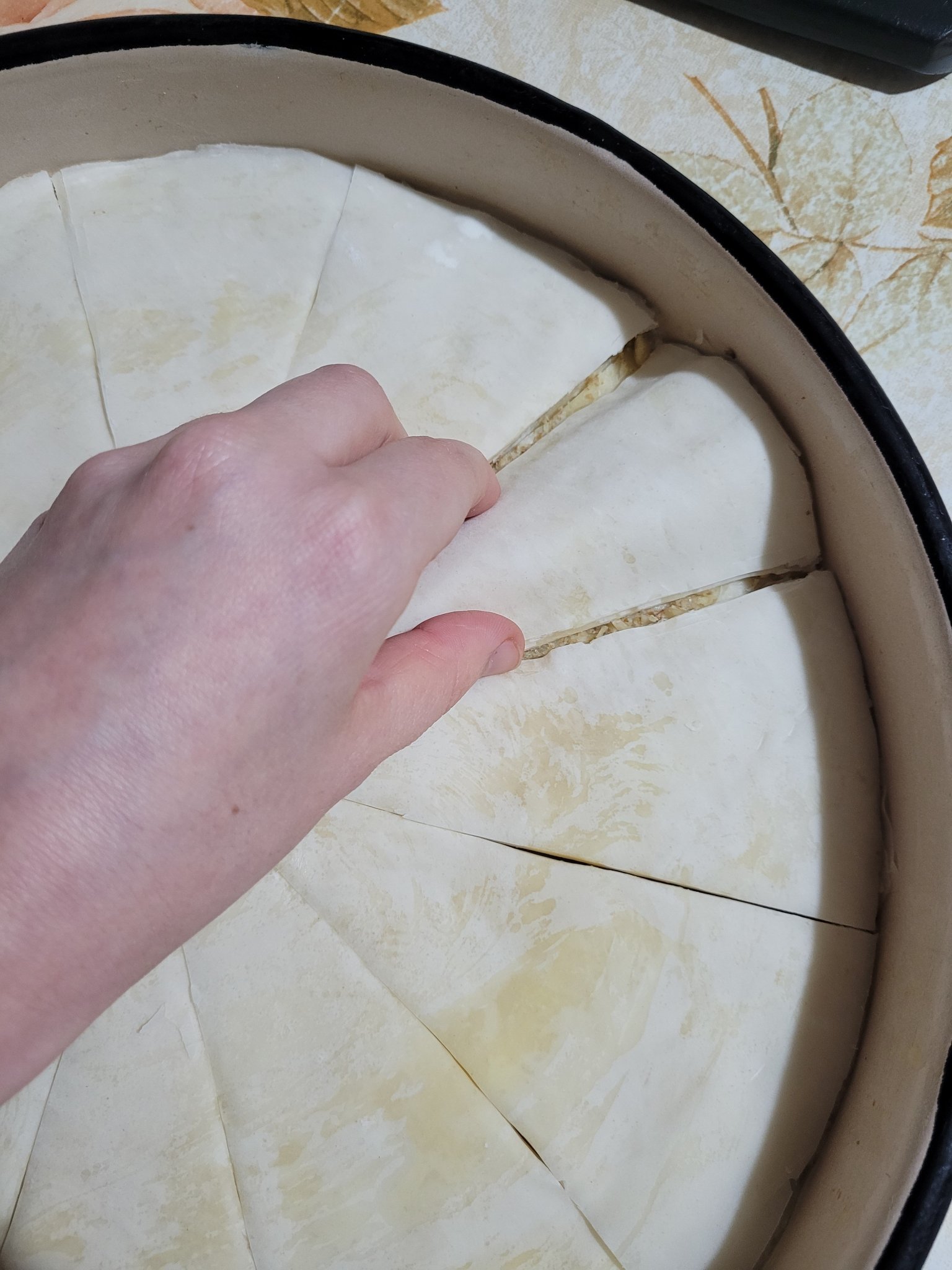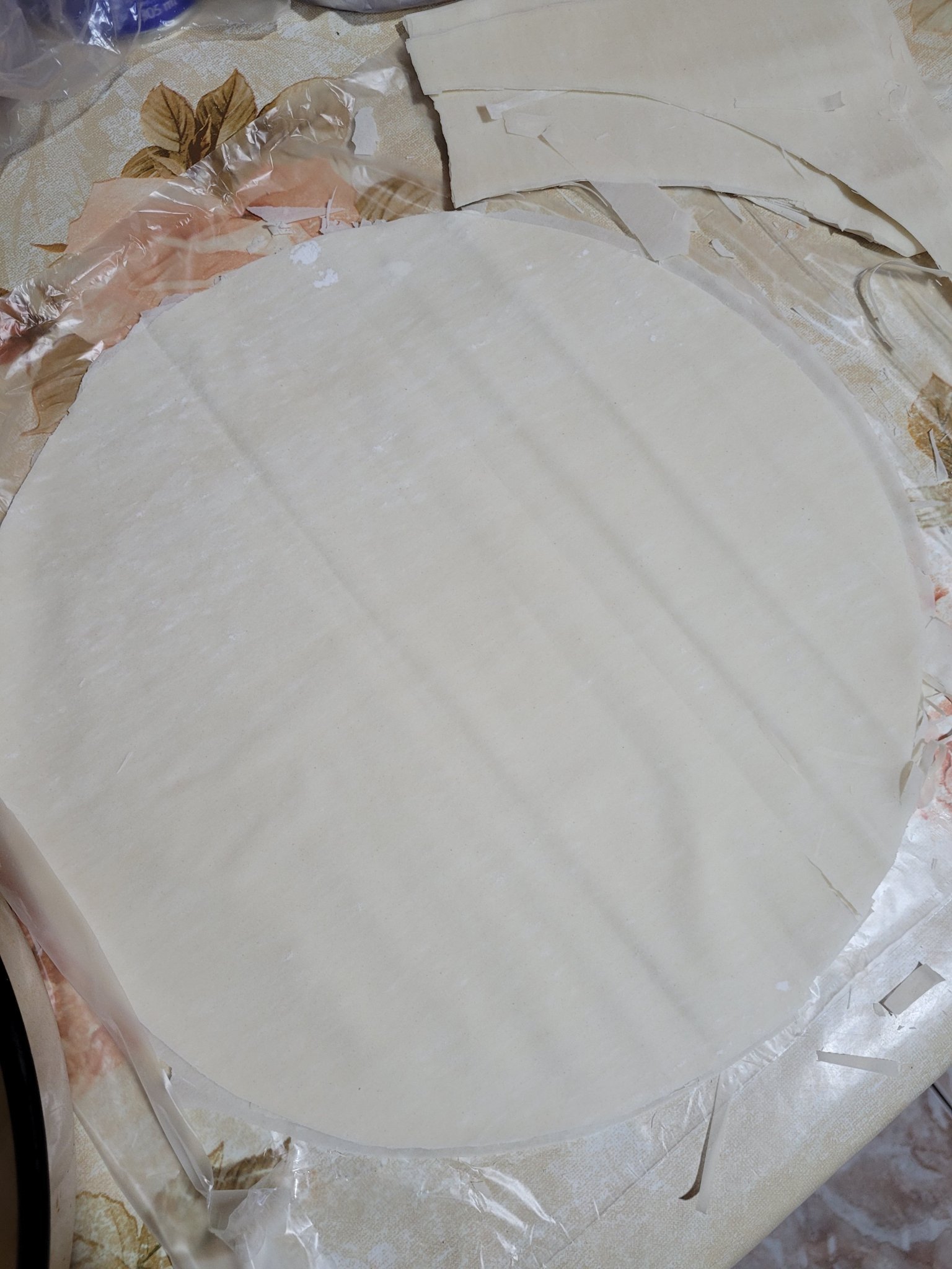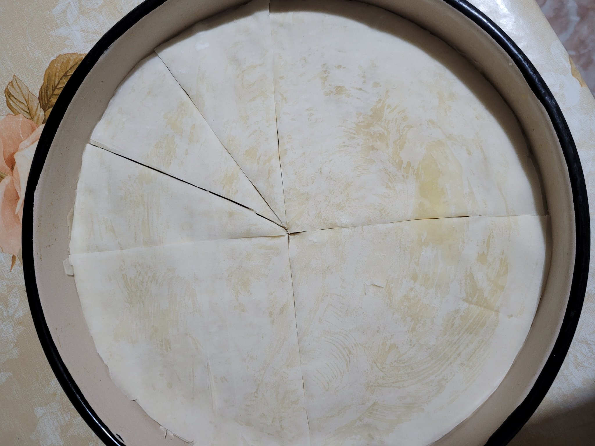 Намачкайте голям лист хартия за печене под течаща вода. Поизгладете го отново и разстелете на дъното на намазнена тава (аз ползвам тези на брио, но може да ползвате всяка правоъгълна тава), а отгоре на хартията поръсвам леко със зехтин.