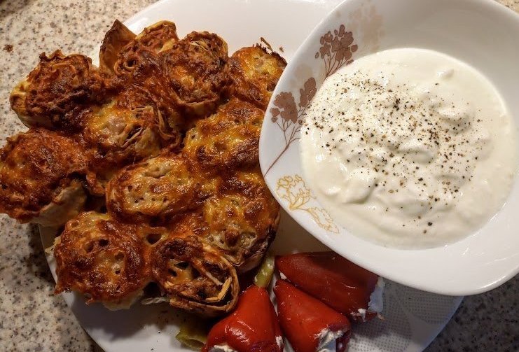 Мойта е, лаваш, намазан с  кайма, навит, нарязан на хапки, и печен на фурна.Отгоре този е поръсен към края и с кашкавал.