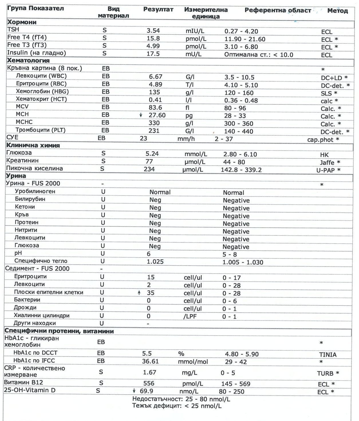 Пуснахме изследвания да видим как ми е щетовидната. Тя искаше да пуснем само TSH, но аз си пуснах и  FT-3 и FT 4.