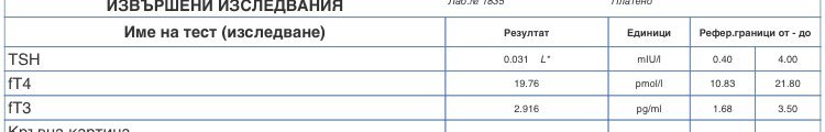 Здравей моля за мнение за изследванията ми.  Пия еутирокс и явно ще трябва да намаля дозата. Имам записан час за ендокринолог. Не разбирам защо при такова ниско TSH FT4 не е по-високо. И при предишните ми изследвания също е така ако ТSH е 1,5 FT4 e под нормата. Иначе се чувствам перфектно с изключение на няколко дни през последните 4 месеца когато не мога да си поема дъх кръвното ми е ниско и сърцето ми тупти много силно но не бързо.