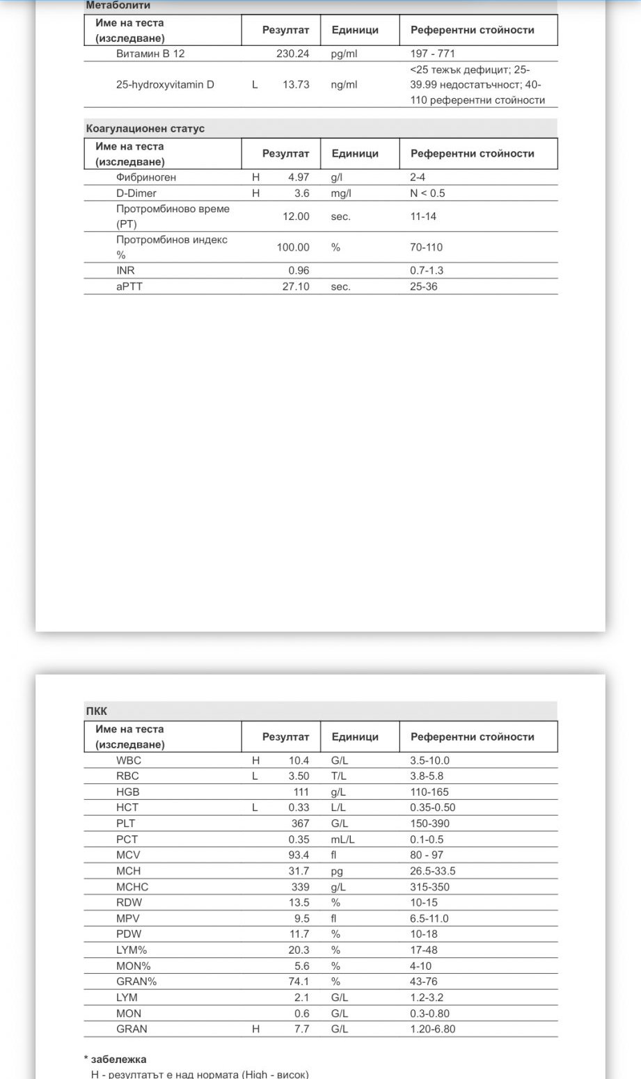 Трябва да вдигнете витамин Д ,защото е доста нисък,витамин б12 също приемайте всеки де.Д димер е доста по-висок от нормата за триместъра,трябва да обсъдите с АГ прием на антикоагулант.