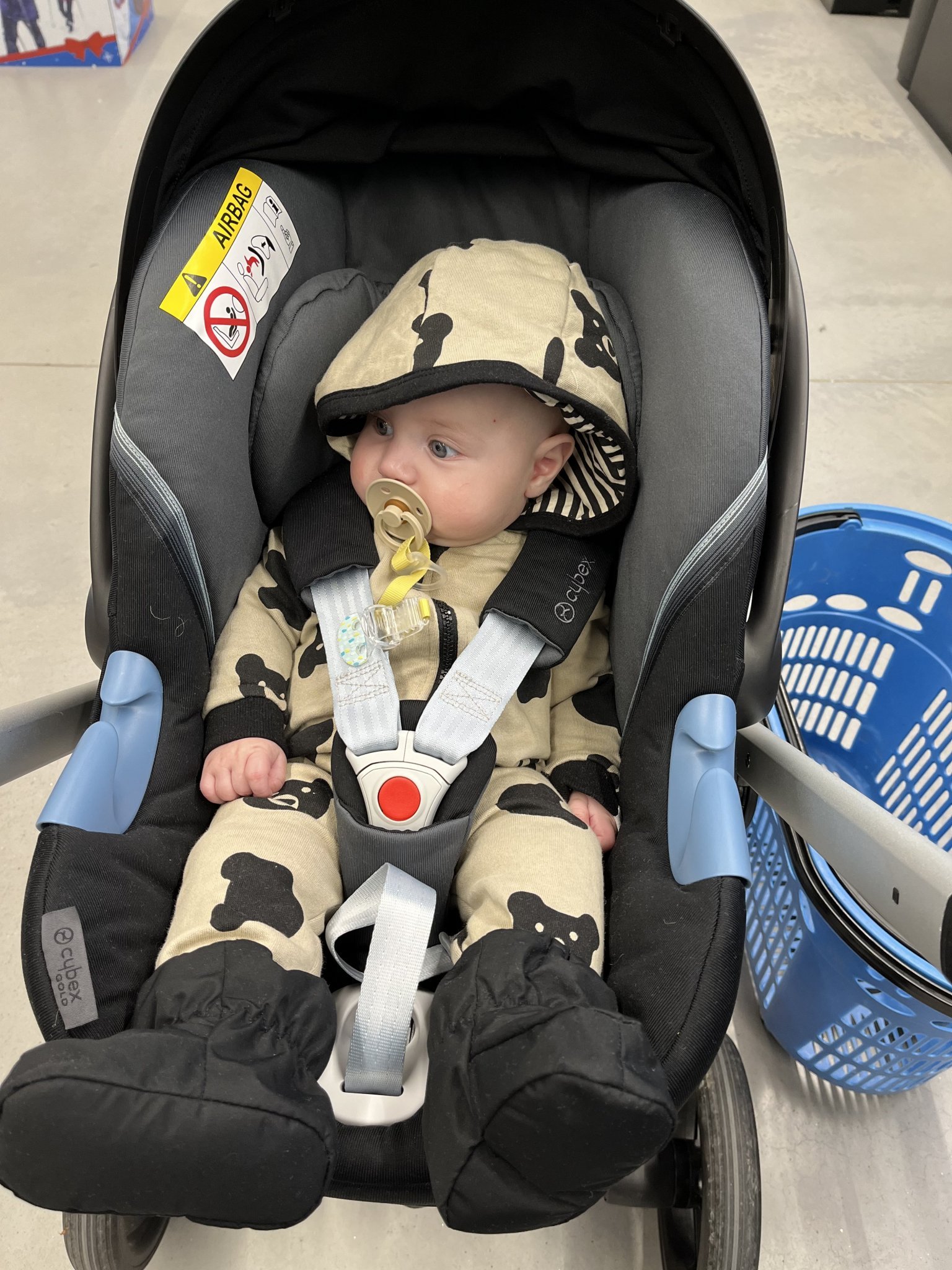 Да ви кажа пак каква драма със столчето и облеклото. Ходихме набързо до Декатлон и да си вземем нещо за ядене след като ММ приключи работа. Нашия в кошницата за кола и в количката с нея. Облечен с потник, чорапки и гащеризончето от Пепко