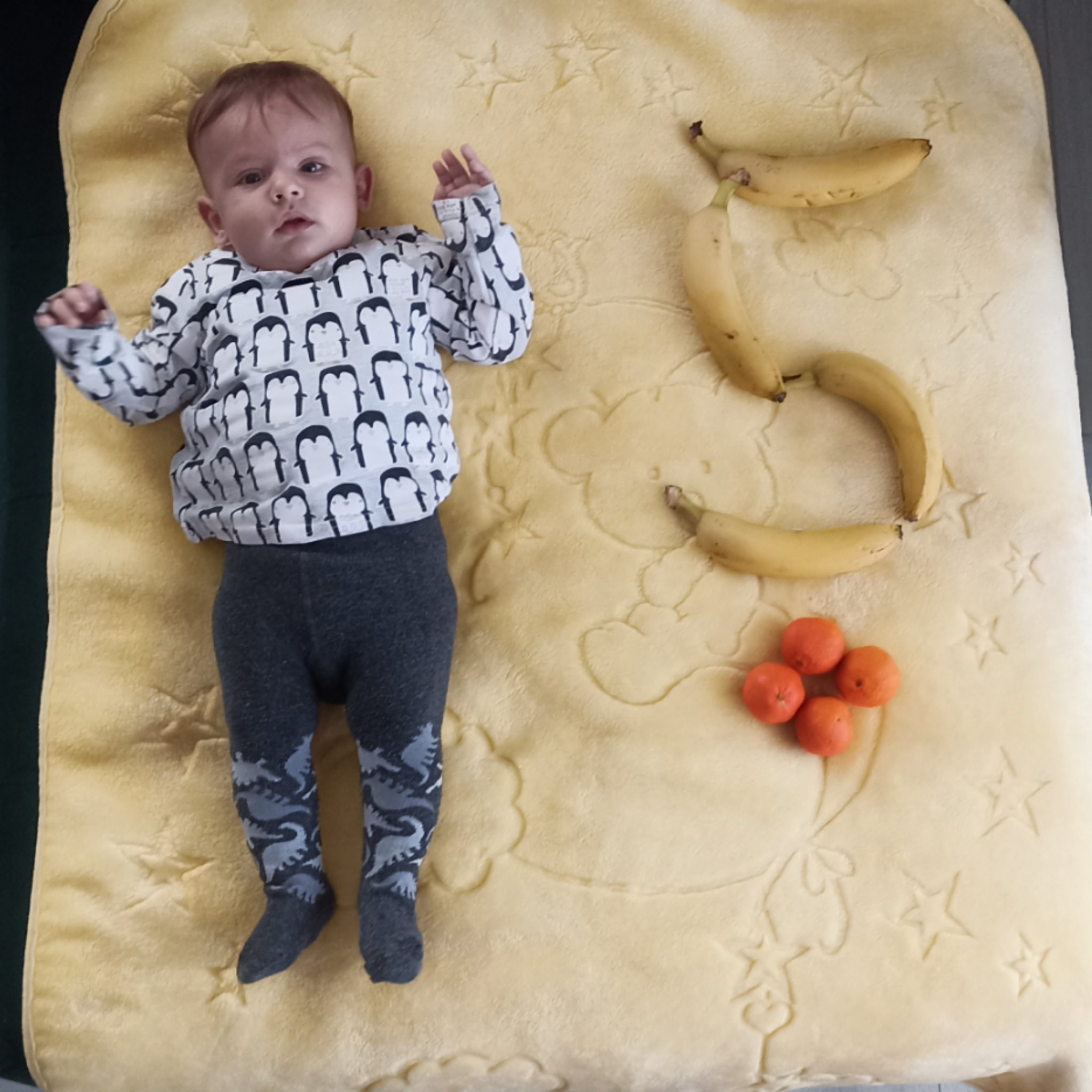 Много са му интересни крачетата. Постоянно ги вдига, гледа и вече си пипа и пръстите, но не е схванал, че са и доста вкусни. Даже докато яде търси да ги хваща.