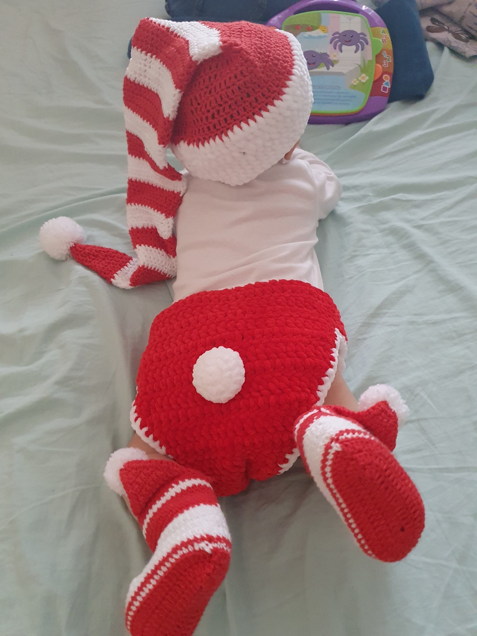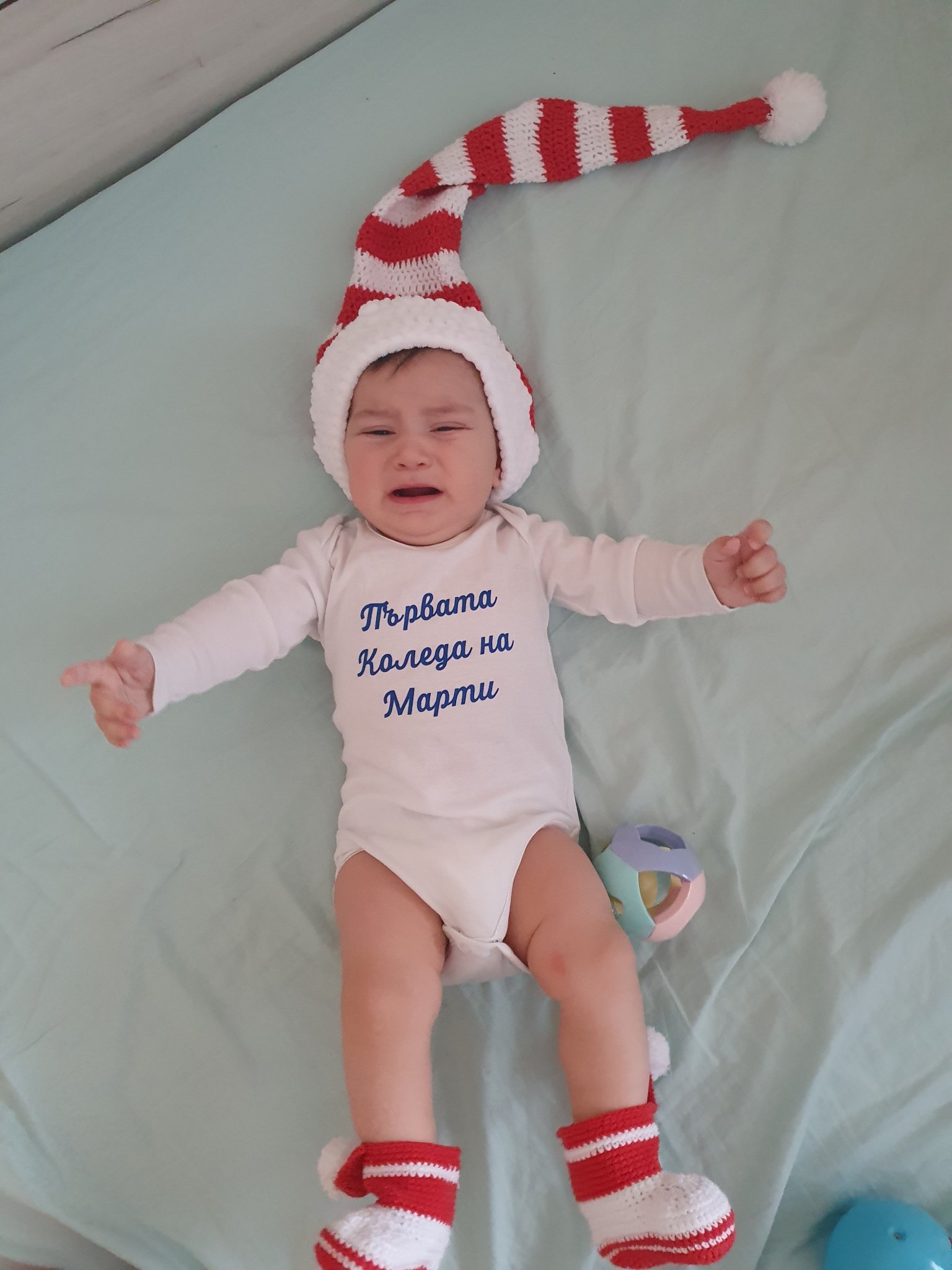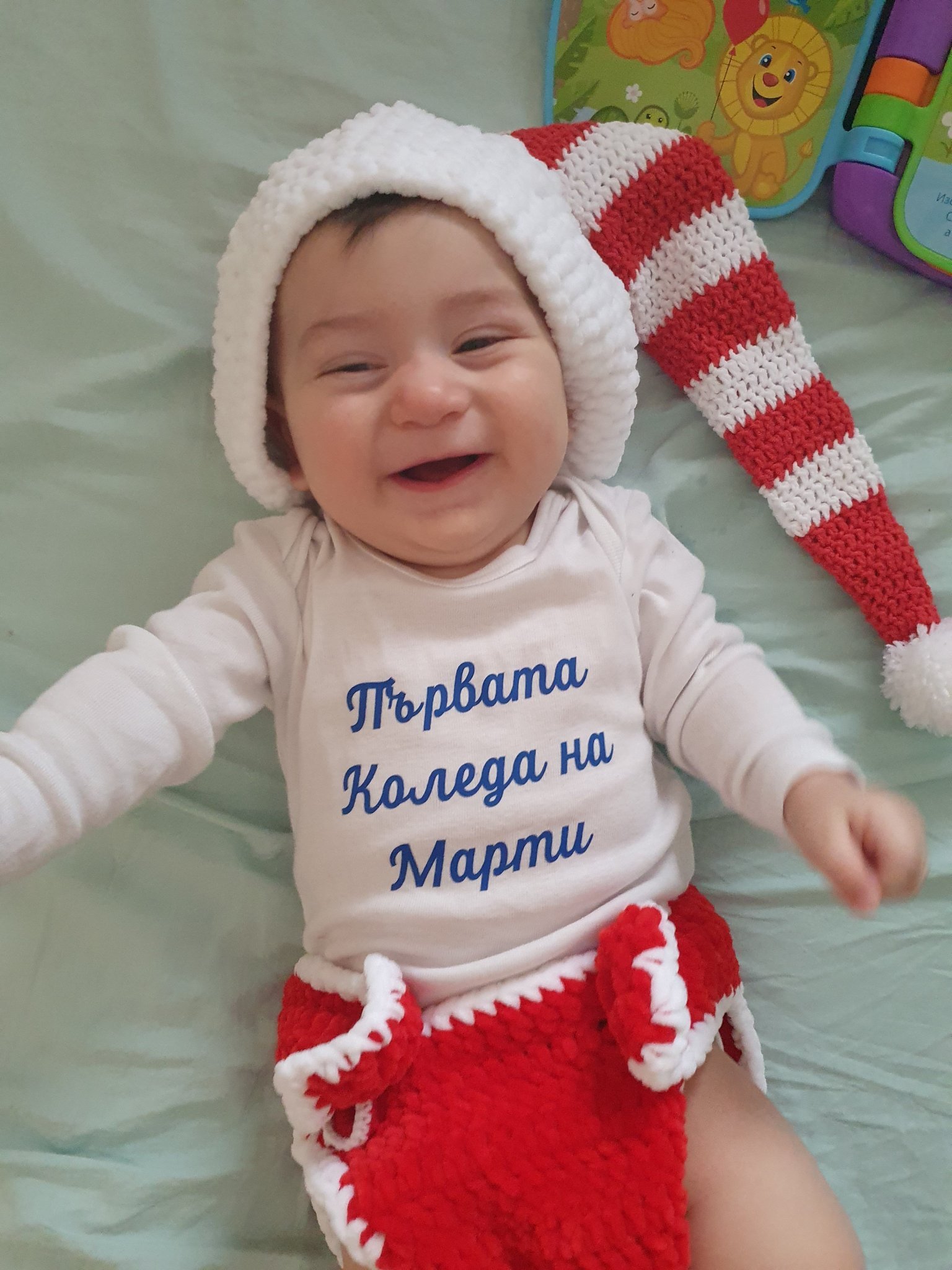 Преди няколко дни му правих още коледни снимки с дрешки, които майка ми му оплете.
