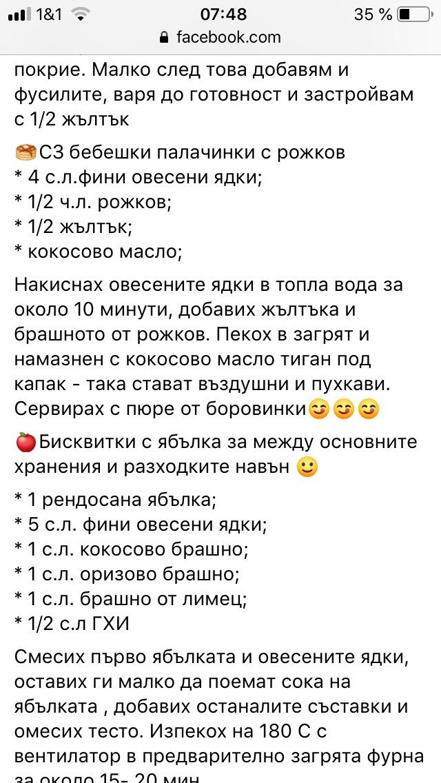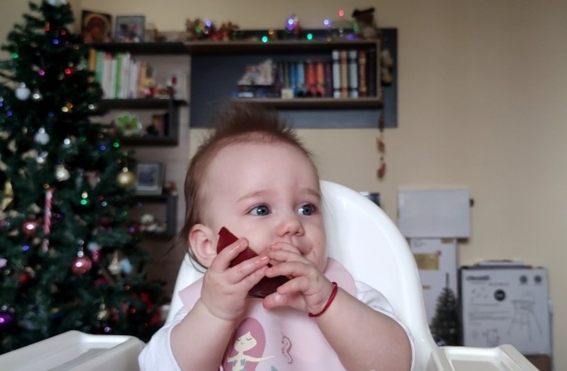 Сега на тази възраст помня, че правилото беше дебело като дланта и поне два пръста да е голямо парчето, което им се дава. На каката давах да гризе краставица и много хубаво си обираше сърцевината, но такъв беше сезона с нея (и това много съобразявам в захранването), също така и диня, нея я ближеше милата 😁 Мисля бях споменавара, с голямата бях направила ЗВБ без да съм чела и чувала дори тогава за това. Зеленчуците в един момент ги пекох на хартия със зехтин или масълце и зелени подправки и така ѝ давах да яде, вместо да пасирам и така започна да яде повече като количество, че голяма лигня стана с тези пюрета. Гледам си записките блъскала съм ябълка, круша, само и само да ги яде. Месото хич не го яде в пюре, само дето се препотих с един заек да го наглася. Като направих едни кюфтета от тележка кайма, да видиш как ѝ плющат ушите. И не е имала един зъб тогава, май на 8 месеца. Яйчени мъфини съм правила със зеленчуци, пък колко домашни гризини, палачинки, бисквити и т.н. Бисквитки се скъсах да правя, не ми харесваха тогава други като състав.