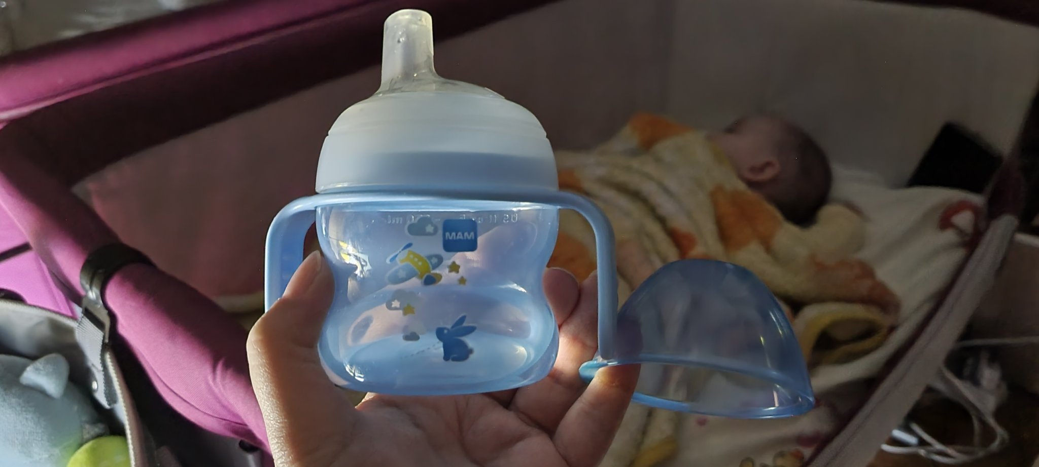 За вън има неразливно шише на Мам, но не с биберон за мляко. И с него се справя добре.