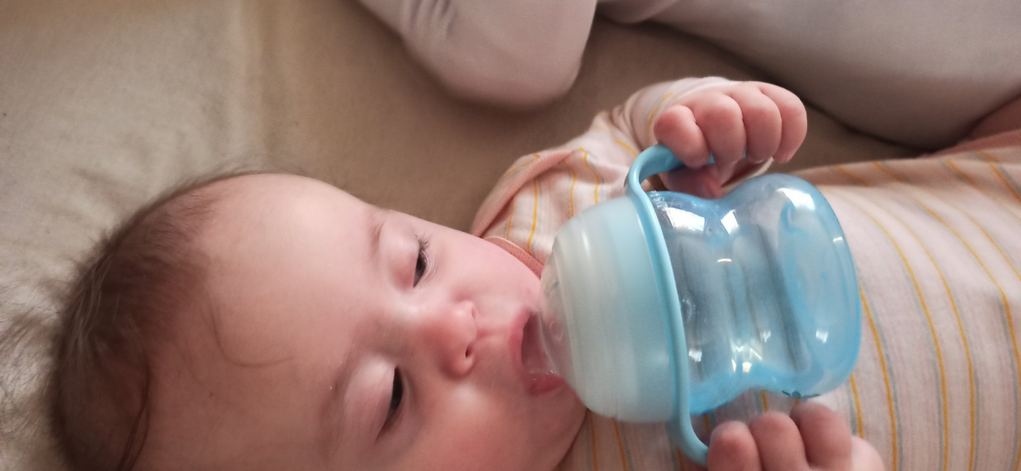 Лъчи пие вода от това шешенце. Тези дни започнах да й предлагам вода малко по-често. Пие по няколко глътки. Не съм засичала милилитри. 400 мл вероятно е общото количество течности за денонощие. По фонтанелата не мога да преценя защото е на косъм от затваряне и не я виждам.